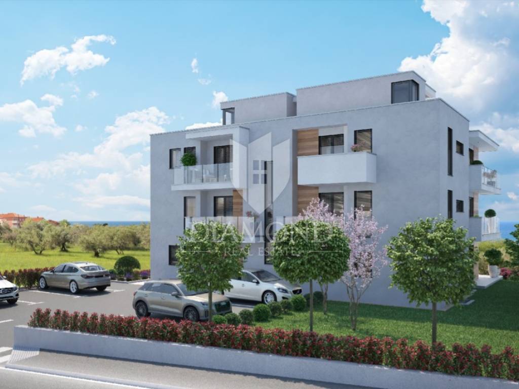 The apartment is located on the ground floor of a new modern building with an elevator. The total area of the apartment is 93 m2. It consists of a living room with a kitchen and a dining room, 3 bedrooms, 2 bathrooms, a hallway, two terraces of a total of 10 m2 with a wonderful view of the sea and olive groves. It is built from high-quality materials with floor heating using a heat pump and cooling using air conditioners. The apartment has a garden with an area of 78 m2, 1 parking space for use, its own storage room, and the possibility of buying a furnished basement between 33-37 m2 with a toilet is offered.