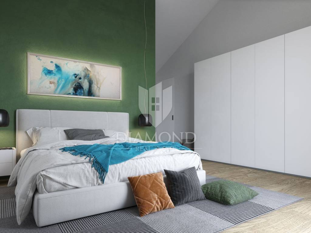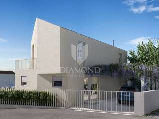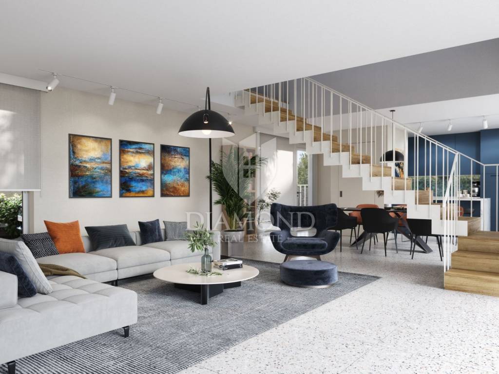 Poreč, surroundings, nice house 100 m from the sea! This nice detached house will be located just 100 m from the first beaches. Its total size will be 135.17 m2, and the yard will be 376 m2 in total. The house is spread over two floors. On the ground floor there is a living room, kitchen and dining room according to the open space concept, toilet, storage room and boiler room. An elegant internal staircase leads to the first floor, where there are two bedrooms with private bathrooms and a terrace. Three-layer glass walls have been installed throughout the entire living room and dining room, which allow a large influx of sunlight, which gives the space itself a large source of light. The living room and dining room lead directly to the covered terrace where you can enjoy the landscaped garden. The house will be heated by a heat pump on a heat pump. The parking lot is right in front of the house. It is sold unfurnished. Poreč is only 6 km away from the town. Not far from the house there are restaurants, a school and a kindergarten, a post office, a shop, a church and paths for a pleasant walk in nature. Poreč and the beaches are only 20 km from the place. The house will be of high quality construction and every detail will be additionally checked. The planned completion of construction is spring/summer 2024. This beautiful villa is an ideal investment for family life in a peaceful environment only 100 m from the sea.