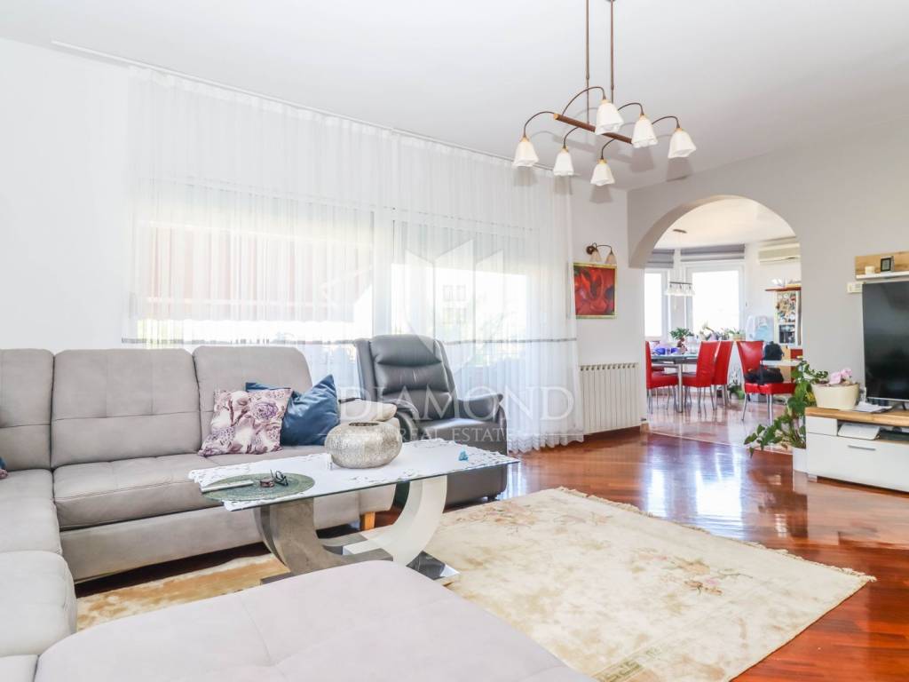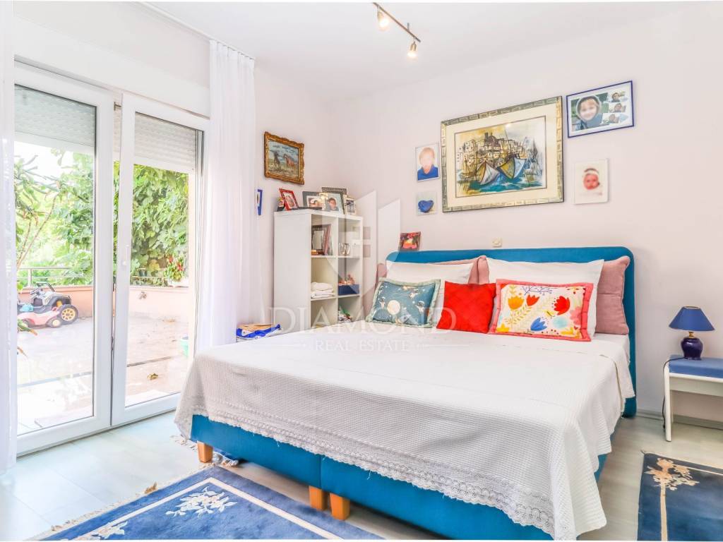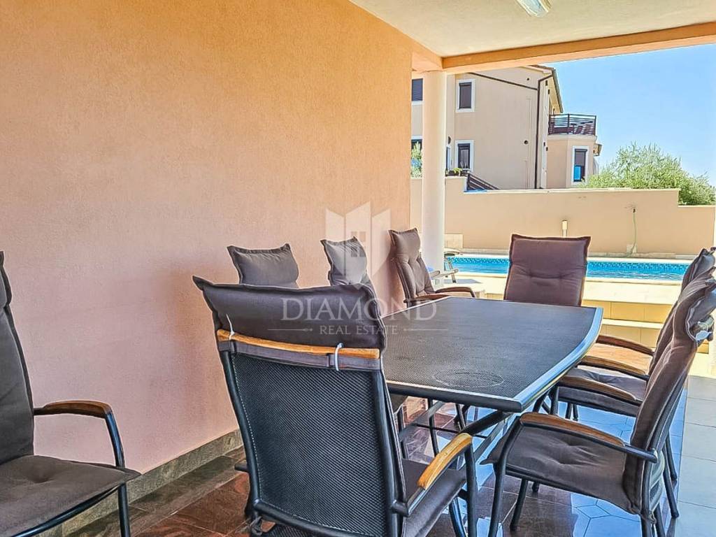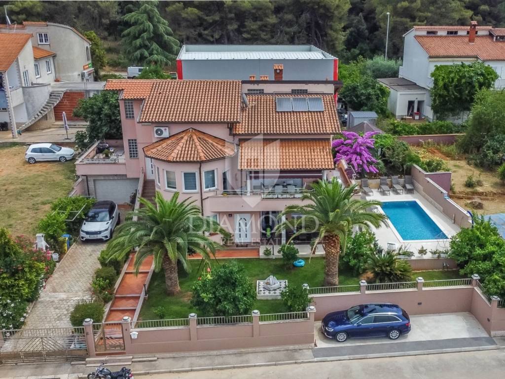 The house was built on a plot of land measuring 785 m2, and extends over two floors, each with 160 m2 of living space. On the ground floor there is an 80m2 apartment consisting of an open living room with kitchen and dining room, three bedrooms with private bathrooms and a terrace with a view of the garden and pool. In the continuation of the ground floor, in the back part of the house, there are three additional rooms and a tavern with a fireplace. An external staircase leads to the first floor where there is a large apartment perfect for a family. The apartment consists of a hallway, a living room with a beautiful fireplace with the option of wood heating, and a kitchen with access to a 30m2 terrace. In the continuation of the apartment, there are three bedrooms and two bathrooms, and one bedroom has access to a large terrace with a view of the sea. Inside the garden there is a garage of 50m2. The yard is completely fenced and is a great space for socializing and summer parties. In the yard there is a stone barbecue and a swimming pool with a sunbathing area and an open view of the sea.