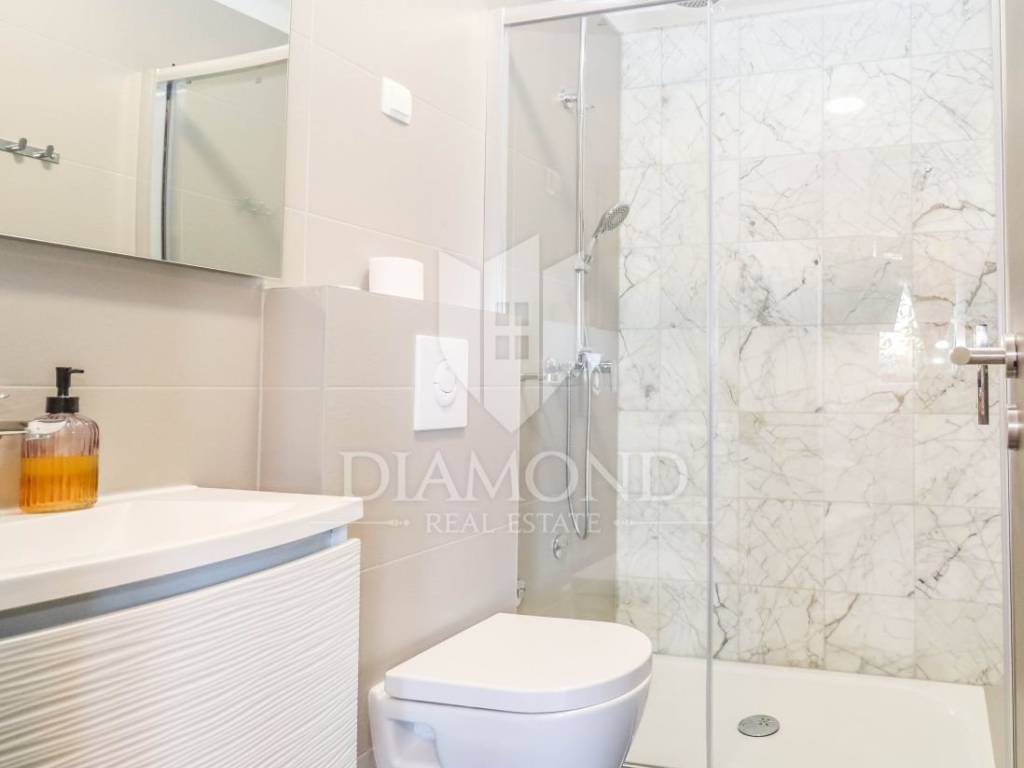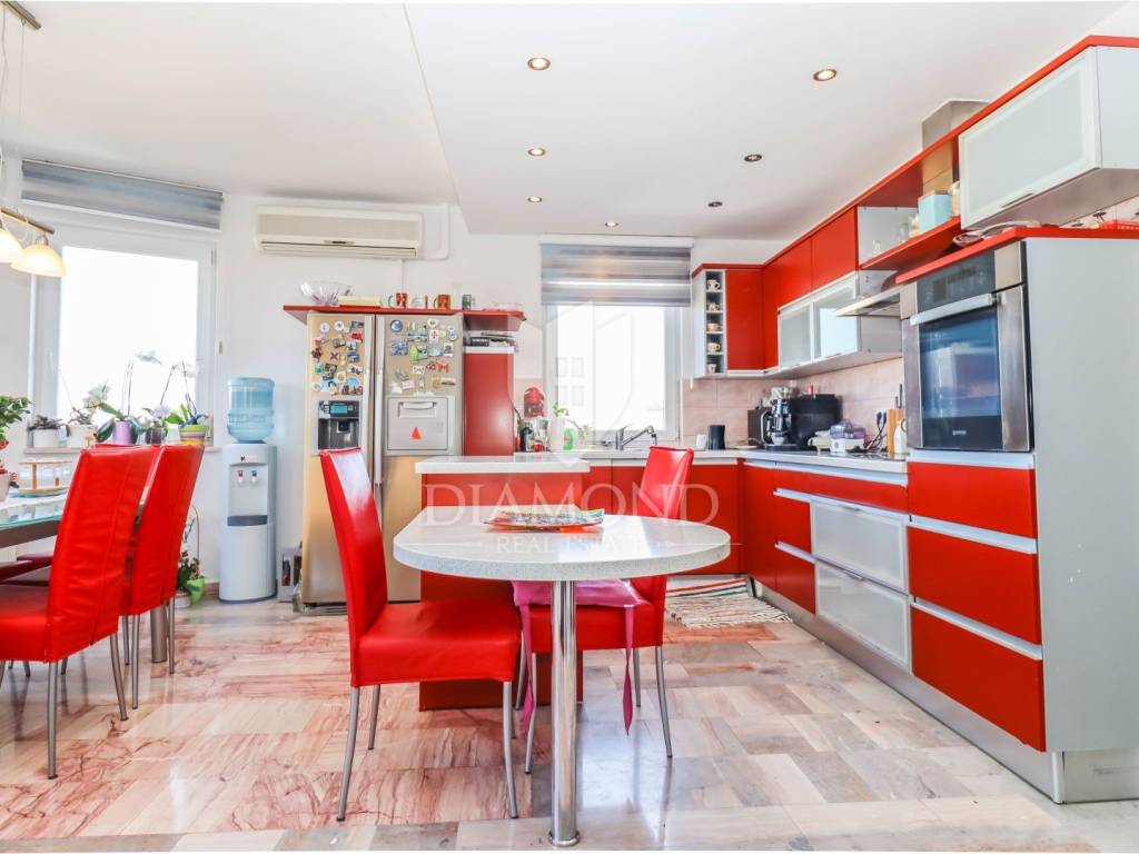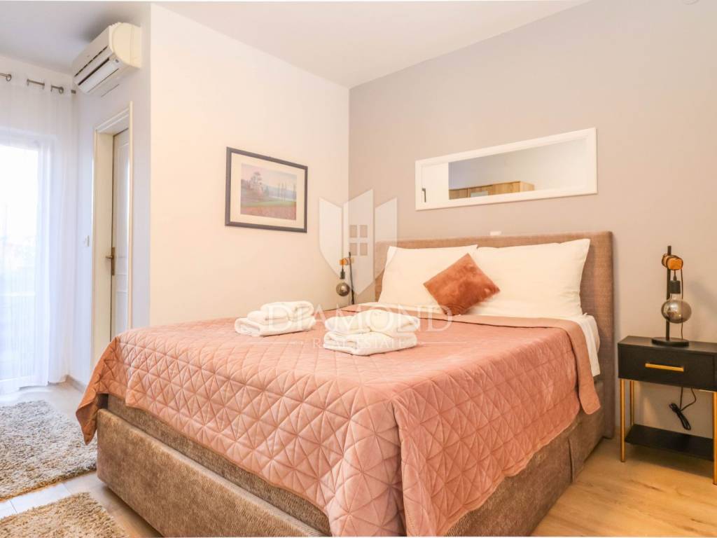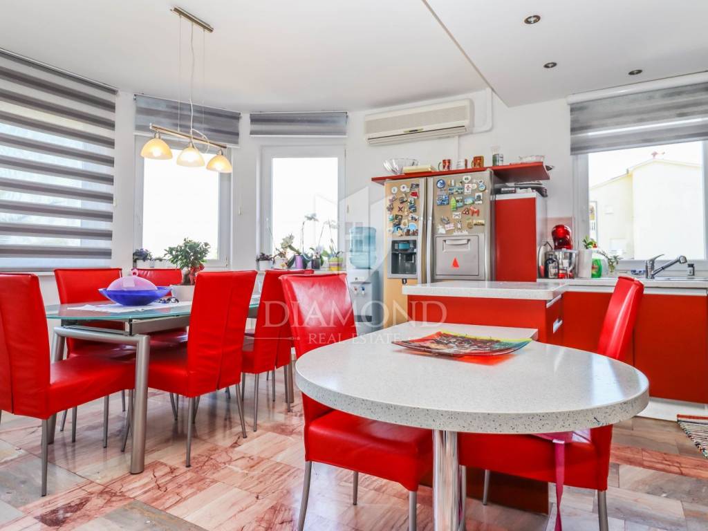The house was built on a plot of land measuring 785 m2, and extends over two floors, each with 160 m2 of living space. On the ground floor there is an 80m2 apartment consisting of an open living room with kitchen and dining room, three bedrooms with private bathrooms and a terrace with a view of the garden and pool. In the continuation of the ground floor, in the back part of the house, there are three additional rooms and a tavern with a fireplace. An external staircase leads to the first floor where there is a large apartment perfect for a family. The apartment consists of a hallway, a living room with a beautiful fireplace with the option of wood heating, and a kitchen with access to a 30m2 terrace. In the continuation of the apartment, there are three bedrooms and two bathrooms, and one bedroom has access to a large terrace with a view of the sea. Inside the garden there is a garage of 50m2. The yard is completely fenced and is a great space for socializing and summer parties. In the yard there is a stone barbecue and a swimming pool with a sunbathing area and an open view of the sea.