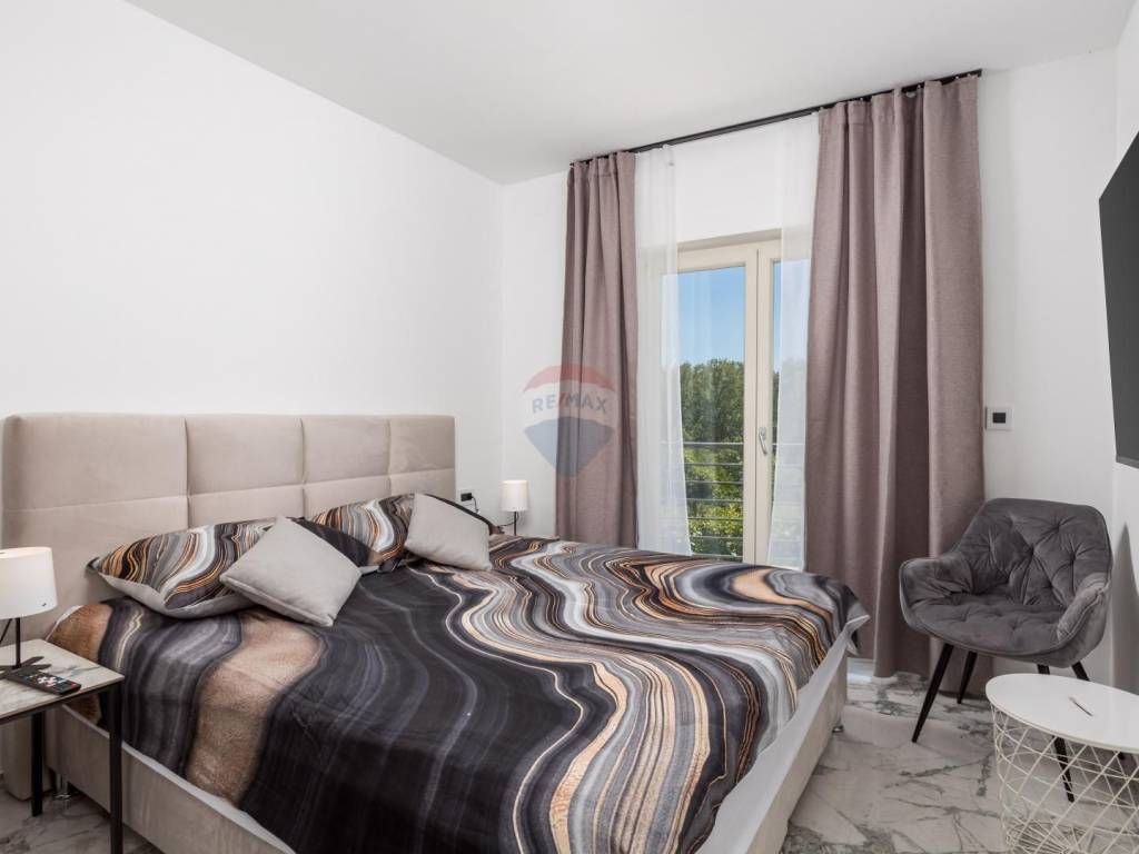 The luxuriously furnished and newly renovated ground floor consists of an open space kitchen with a living room with access to two terraces, two bedrooms, two bathrooms, a hallway and a studio apartment that has a separate entrance and a large terrace. It is possible to connect the studio apartment with an apartment.