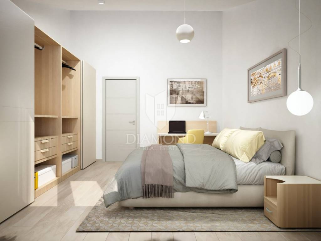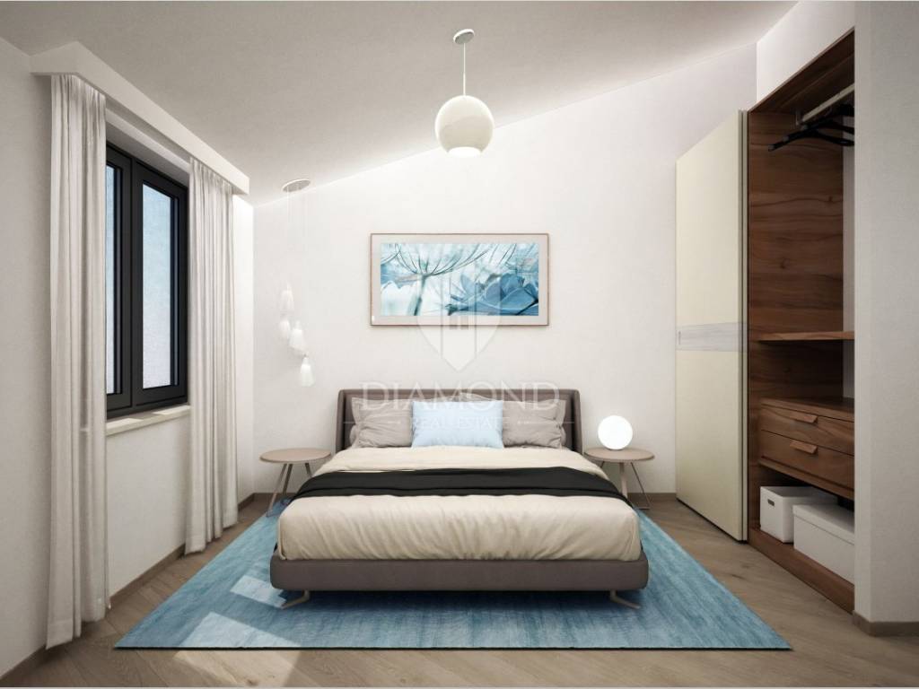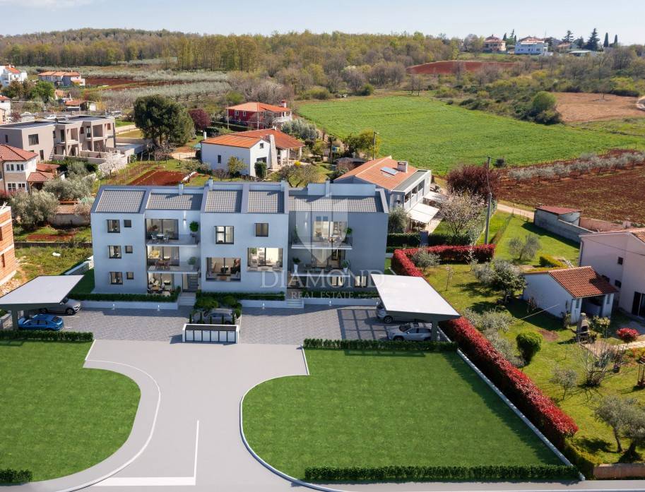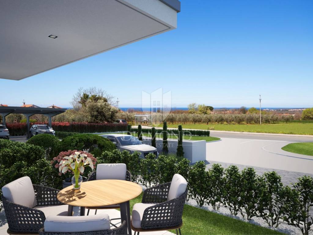 Poreč, great apartment on the ground floor with a garden! A modern building with a total of eight apartments with a sea view is under construction in the suburbs of Poreč. Apartment for sale on the ground floor of a total of 71.94 m2 with a garden of 110 m2. The apartment consists of a living room, a dining room, a kitchen and two bedrooms, a bathroom and a storage room. The living room leads to a pleasant terrace with a view of the sea. The apartment will be heated by air conditioning, and the bathrooms will have underfloor heating. There is a covered parking lot in front of the building. Catering facilities, shops, post office, bank are located near the place. The beaches are only 6 km away. Construction will start in the spring, and the planned completion of construction would be in October 2025. The property is subject to VAT. The amount of the property includes VAT. This property is an ideal investment for tourist rental.