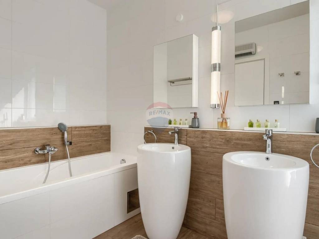 Bedroom #1: double-bed bedroom, En-suite bathroom with shower, bathtub, toilet, twin sinks, opening glass walls to the external areas.