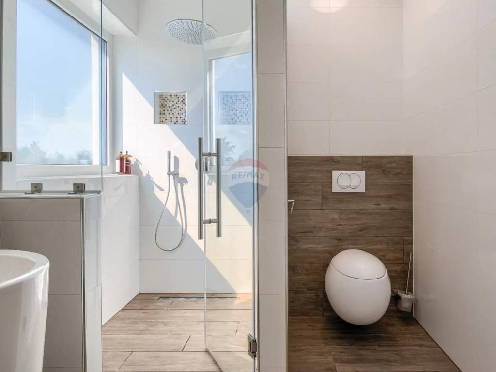 Bedroom #4; double-bed bedroom, single bed 90×200 cm, En-suite bathroom with smart glass window, shower, bathtub, toilet, twin sinks, west-facing terrace with uninterrupted view to the sea and Brijuni Islands;