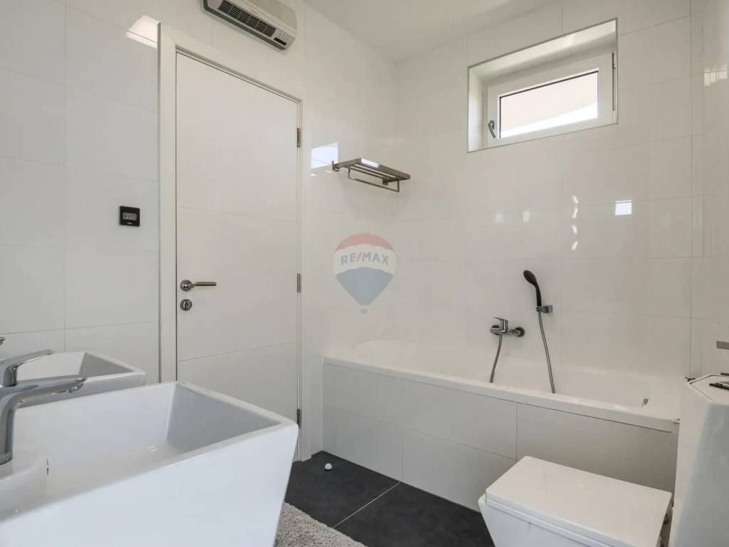 Bedroom #2; double-bed bedroom, En-suite bathroom with smart glass window, shower, bathtub, toilet, twin sinks, west-facing terrace with uninterrupted view to the sea and Brijuni Islands, large sofa bed 160×200 cm for 2 persons;