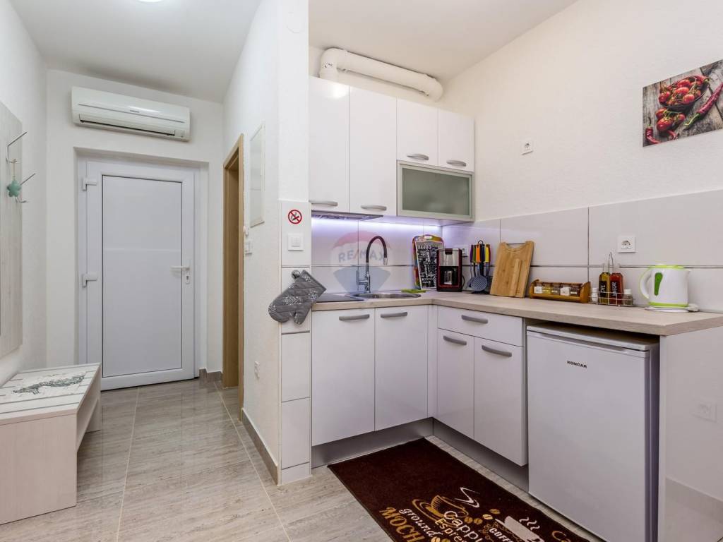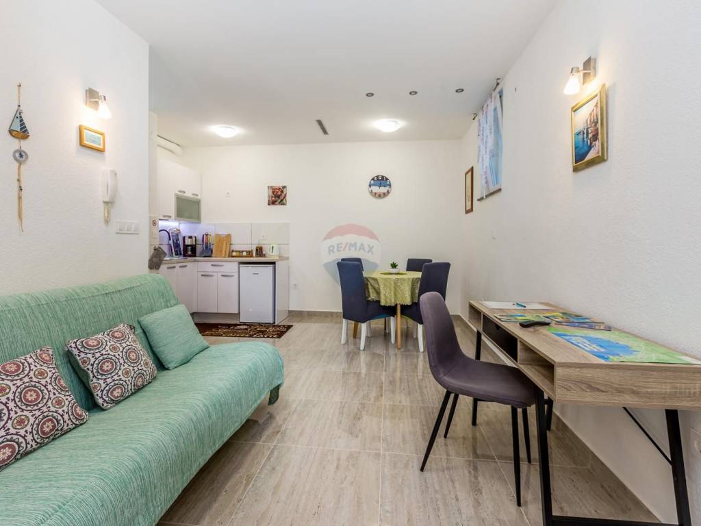 For sale: a one-bedroom apartment with a beautiful garden, located in Malinska on the island of Krk. The apartment is situated in the basement of a residential building and has a total area of 37 m².