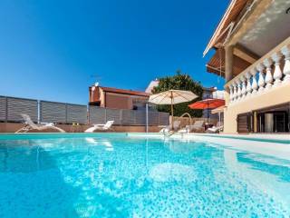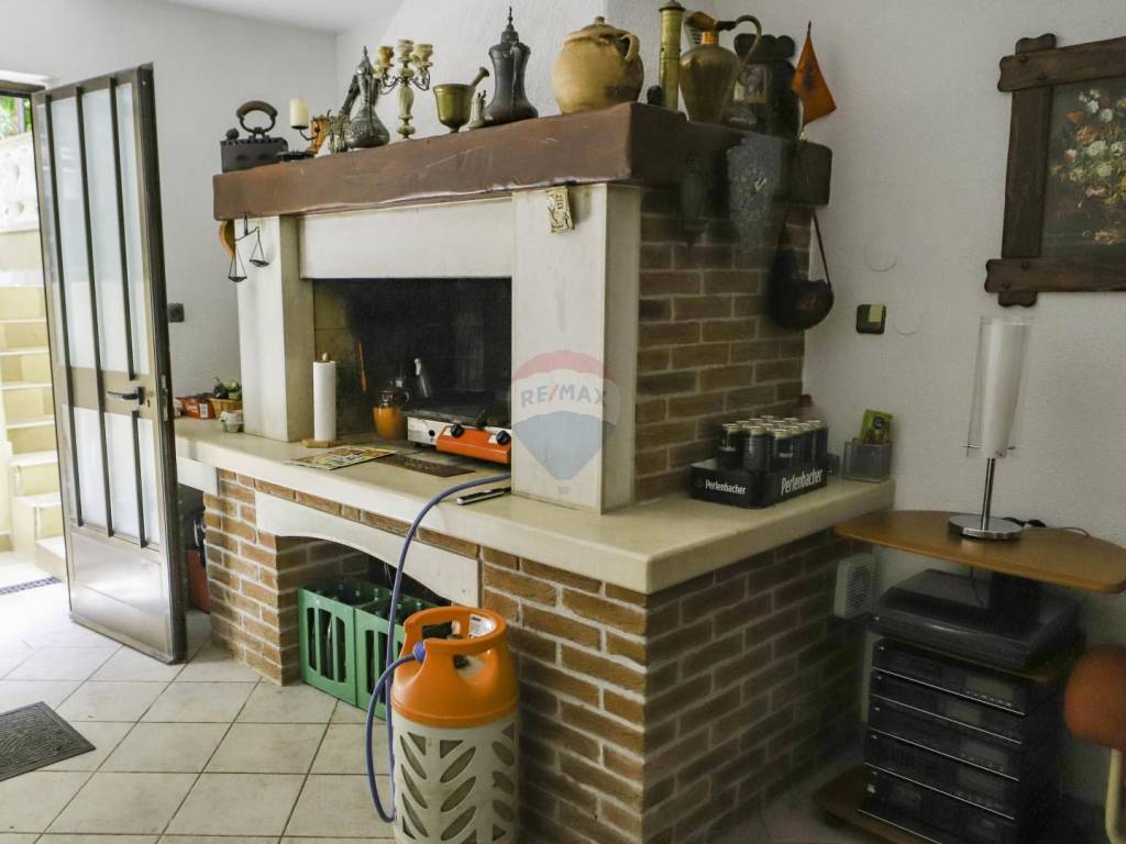 There is also a covered parking space at the entrance. In the yard there is a swimming pool with a beach and a large stone table with a stone bench for 8 people covered with a large awning. In front of the house is also a terrace to enjoy the Mediterranean horticulture where various fruit trees are planted.