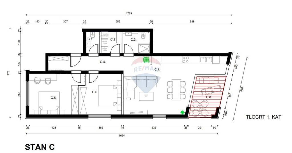 The subject apartment C is located on the first floor of this modern building and has a total of 97.38 m2 of usable area.