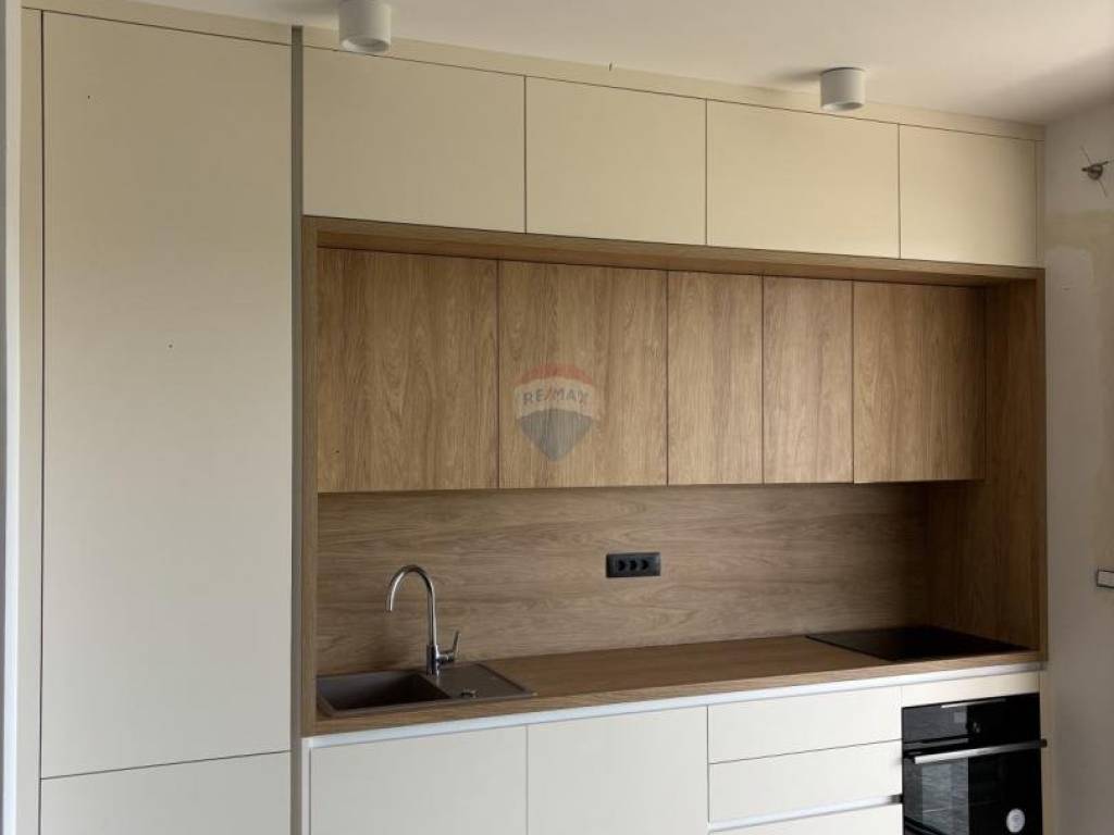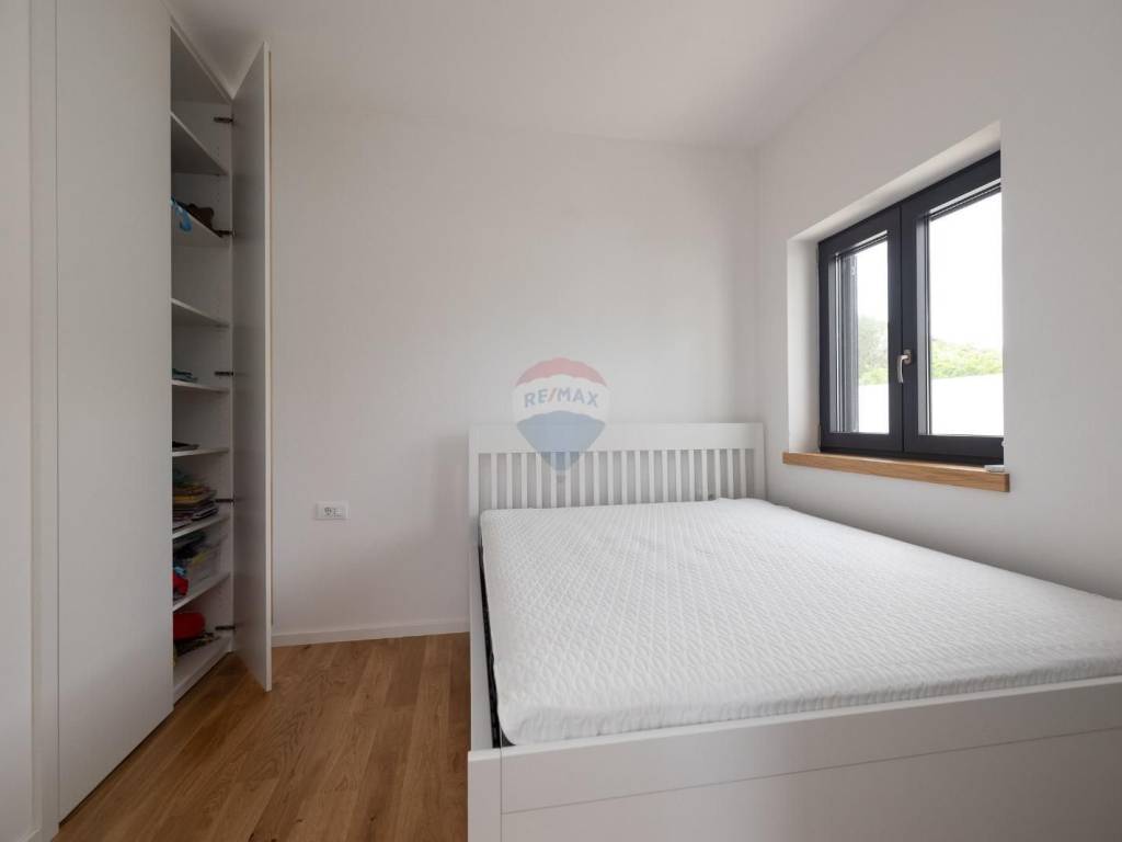 The living space consists of a bright and airy open space living room connected to the dining room and kitchen, and two bedrooms, a bathroom and two internal storage rooms. The kitchen is custom-built with ambient lighting and brand new top-of-the-line appliances under warranty (Heier refrigerator with freezer, Bosch standard-size washing machine, Heier pyrolysis oven, built-in hood). The kitchen upper units are on two levels, which allows for additional storage. The living room is bright and spacious, equipped with a designer leather sofa with movable backrests, a wooden designer coffee table and a new Samsung TV. Both bedrooms are equipped with a queen-size bed with a storage compartment with new mattresses and custom-made built-in wardrobes. The bathroom is of modern design, with a Hansgrohe faucet and shower. The bathtub is designer and specially treated to be non-slip. The house has two separate internal storage rooms. One storage room contains a Bosch boiler and underfloor heating system and a Heier washing machine (new appliances with warranty). The second storage room is located next to the kitchen and bathroom and was planned to be used as an additional storage room.