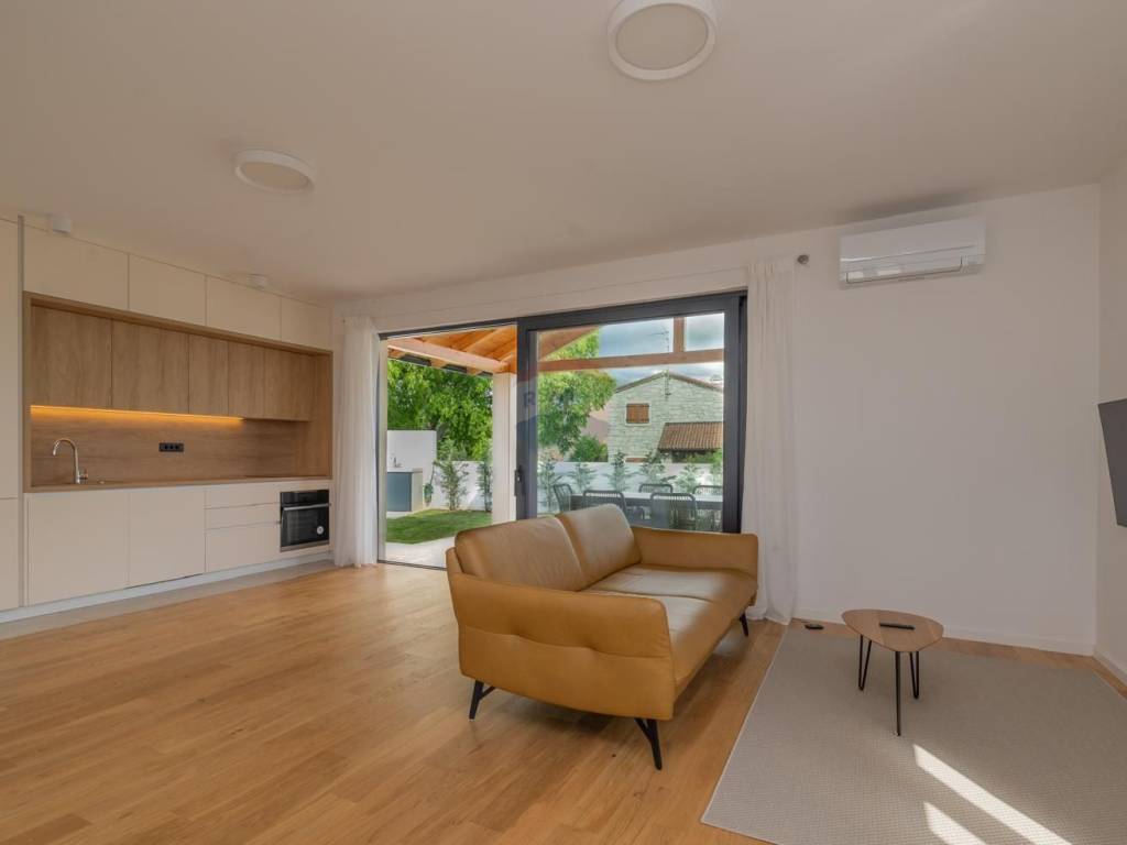 The internal space is connected to the external covered terrace at the same level, using a 4-meter glass wall. The glass wall is aluminum, lift-sliding, which makes it easy to open. The terrace offers a view of the traditional Istrian stone house and greenery, as well as the old town. The terrace is spacious, 22m2 in size, at garden level. It is covered with stone and covered with a roof, which allows the outdoor space to be used in all conditions. It is equipped with a designer table and six outdoor chairs. The terrace is connected to the summer kitchen by a stone path. The summer kitchen consists of a built-in stone slab measuring 3 meters, lighting, a large Klarstein electric grill, an external sink and storage. There is also an outdoor shower with a 30l water tank. The outdoor area consists of a garden with planted young grass and an automatic irrigation system (lifting sprinklers). 30 young cypresses were planted along the fence to make the fence a natural green area and ambient solar lighting was installed along its entire length. The equipment includes a Bosch lawnmower, Kercher miniwash, an extension cord for electricity and a water hose.