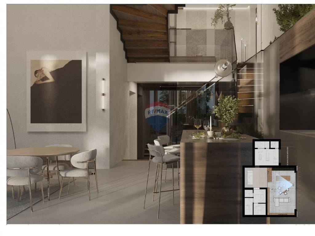 The villa is designed as a three-story 4-bedroom + living room apartment connected by an internal staircase.