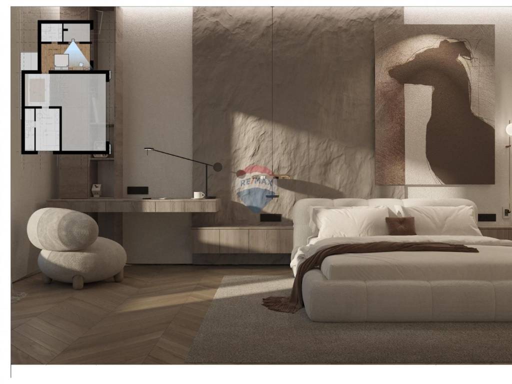 On the 1st floor there are: 2 bedrooms, each with its own bathroom and access to a private terrace with a sea view, and a hallway.