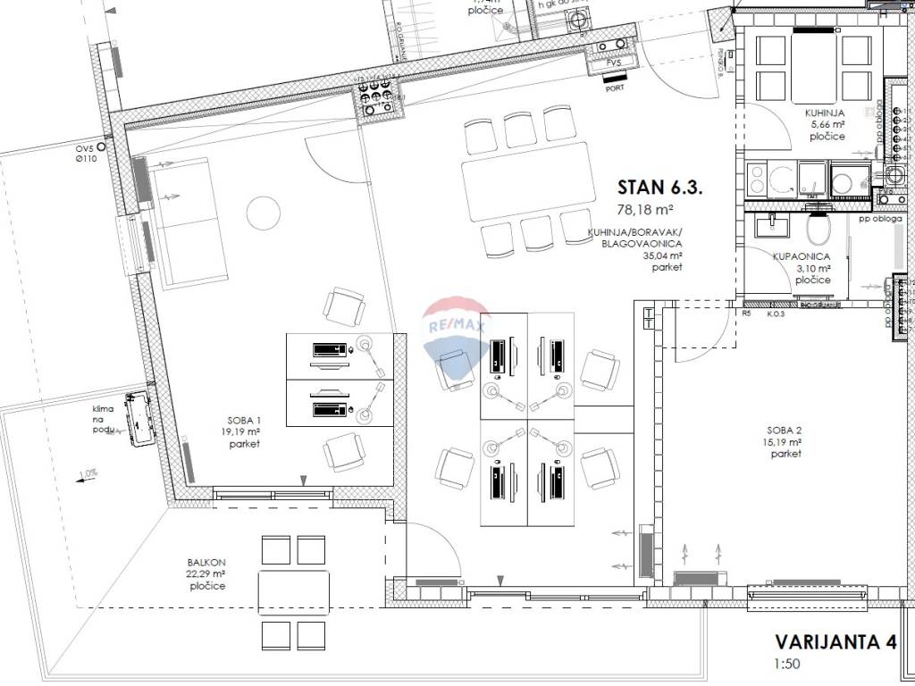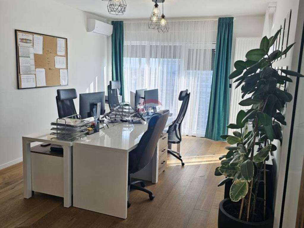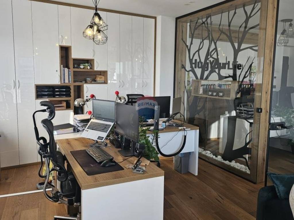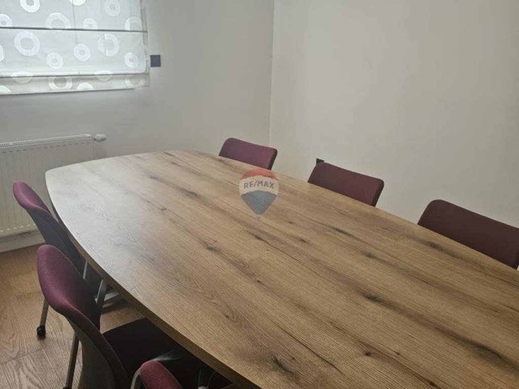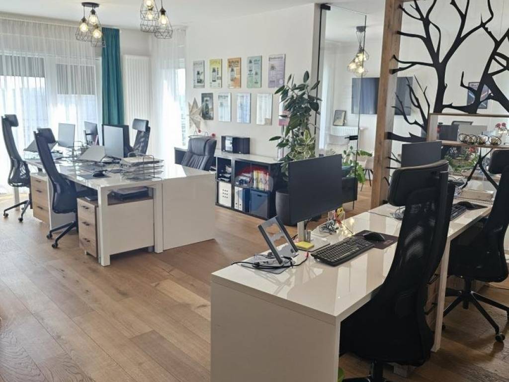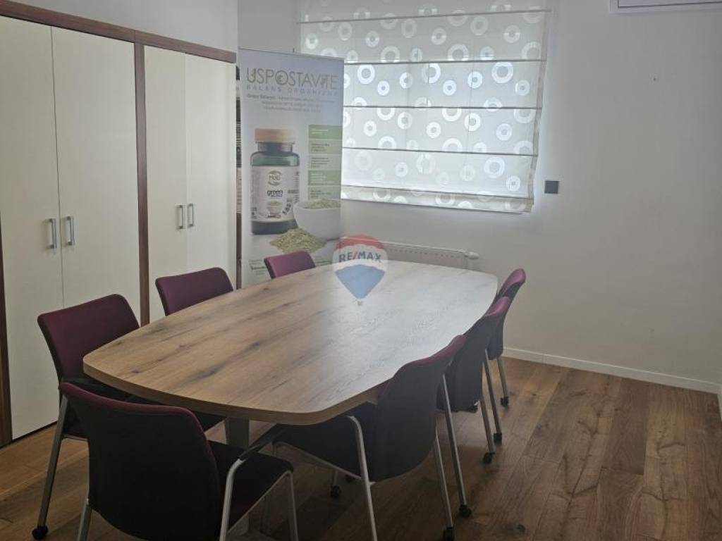 Sastoji se od tri odvojene uredske prostorije, kuhinje, toaleta, prostranog balkona s kojeg se pruža predivan pogled te se uz prostor, uz nadoplatu, iznajmljuje jedno garažno parkirno mjesto.