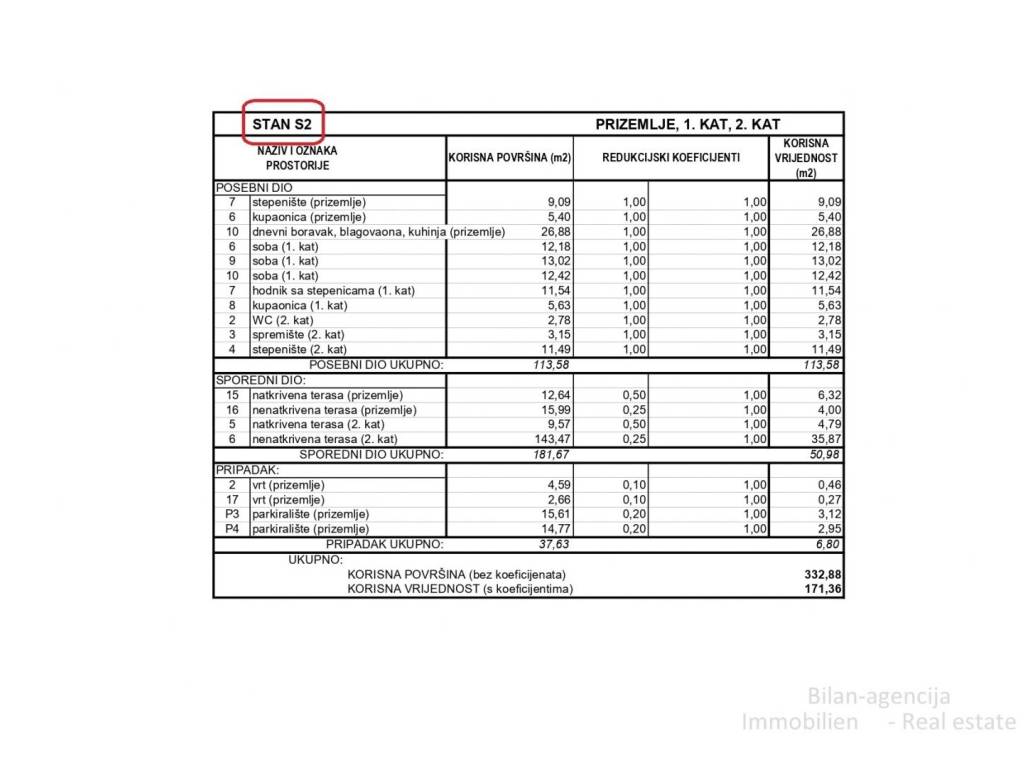 The apartment has a garden of 7.20 m2, three covered terraces and one uncovered terrace with a total of 181.67 m2, two parking spaces with a total area of 33 m2.