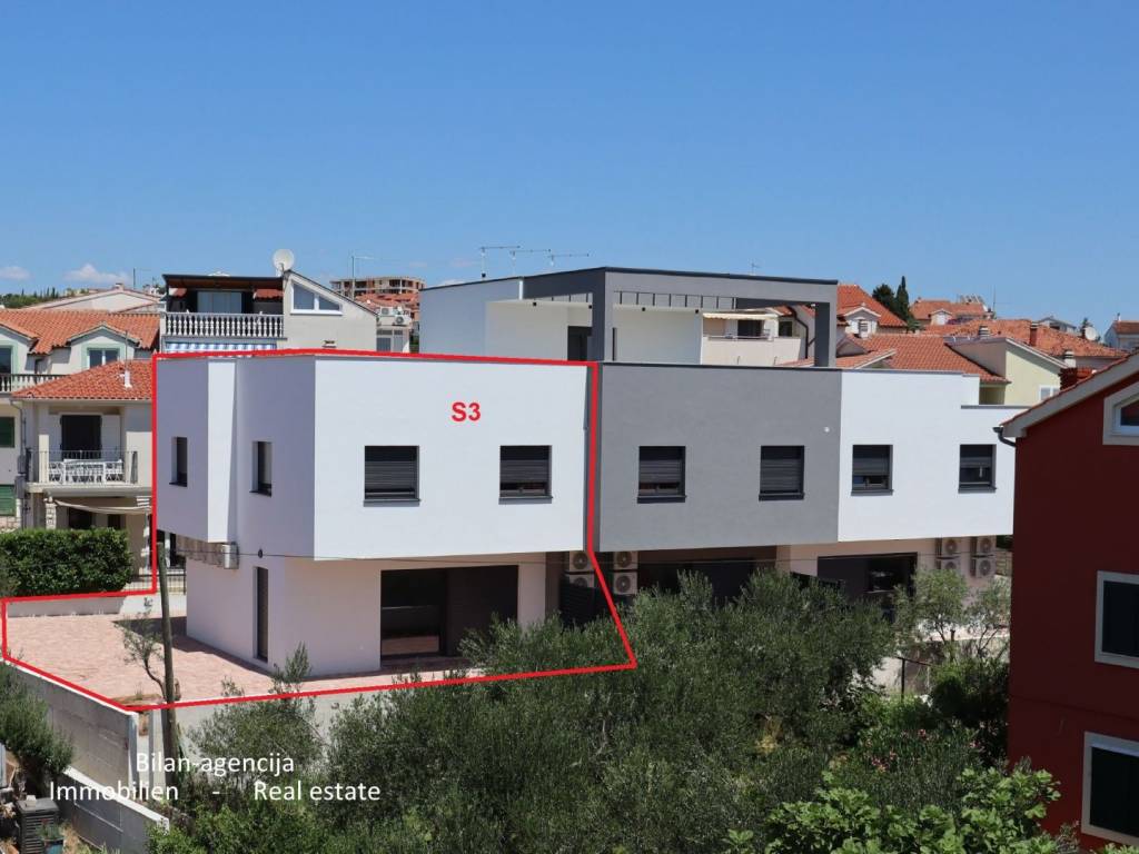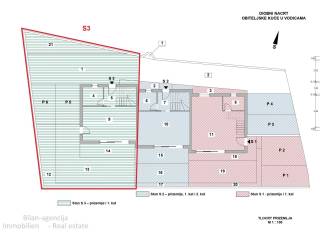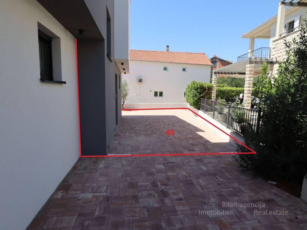 The apartment has a garden of 35.37 m2, a covered and uncovered terrace with a total of 55.21 m2, two parking spaces with a total area of 28.66 m2.