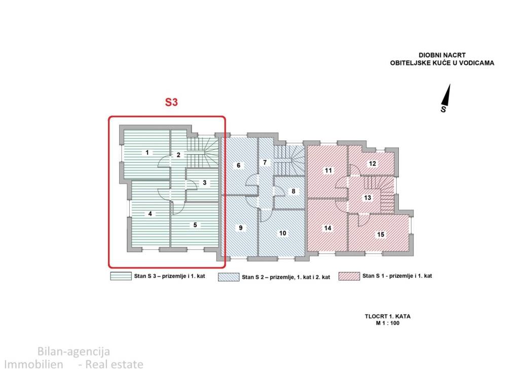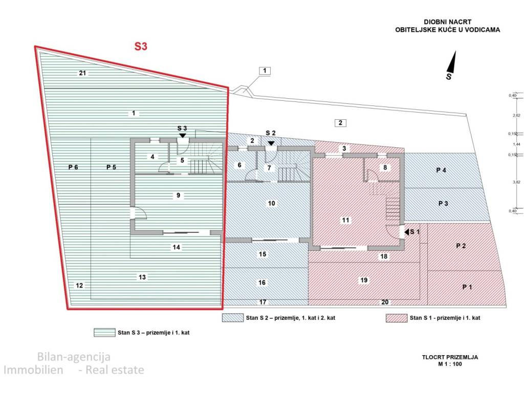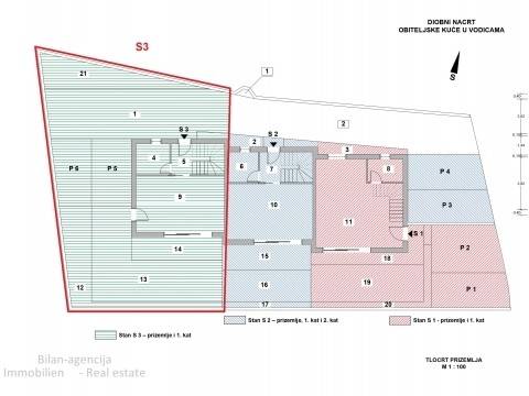 On the ground floor of the apartment marked S3 there is a bathroom, living room, dining room, kitchen, stairs to the upper floor.