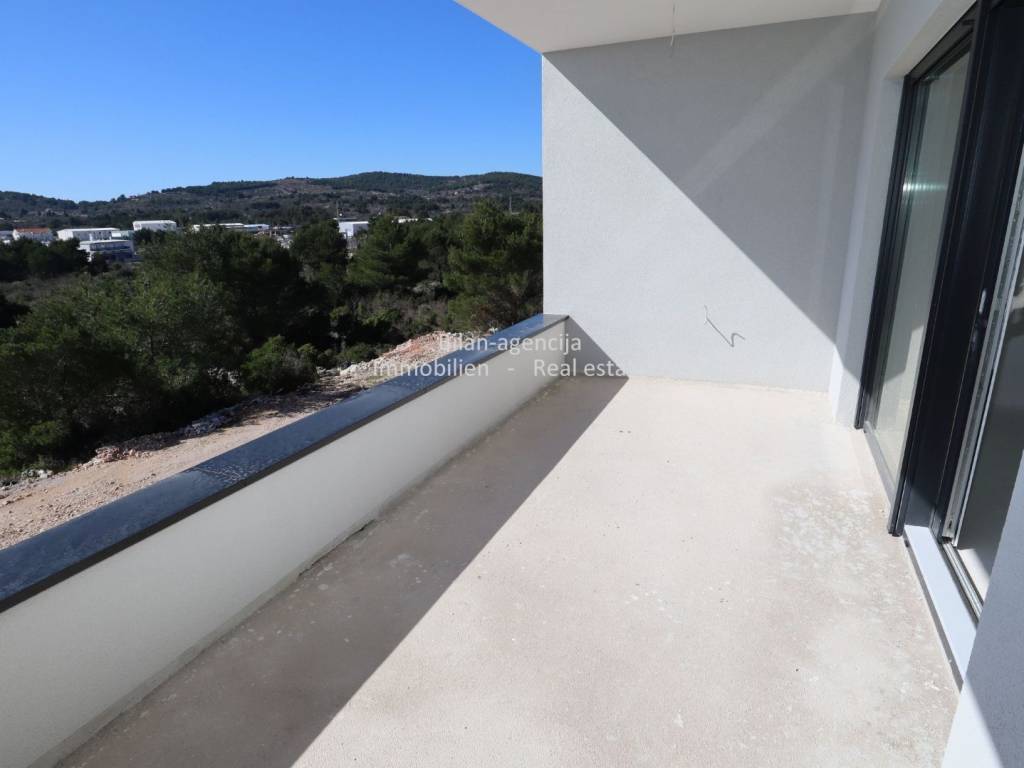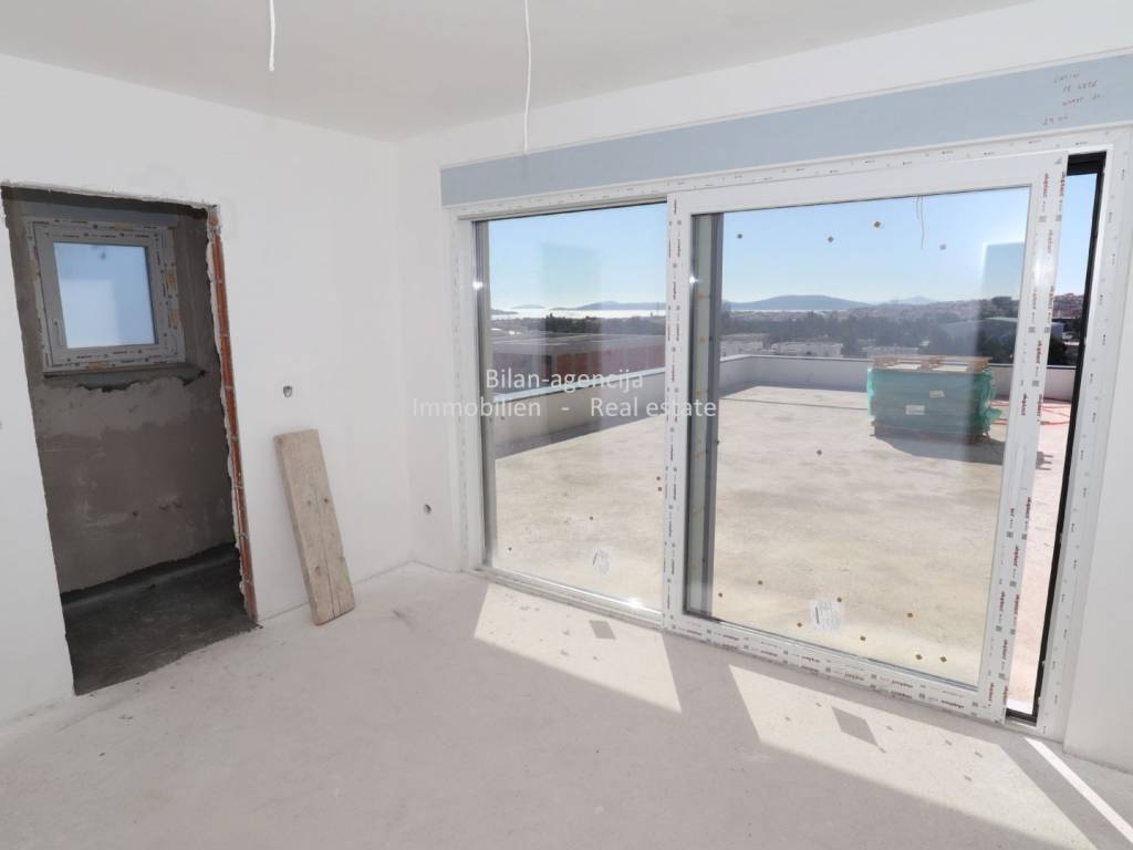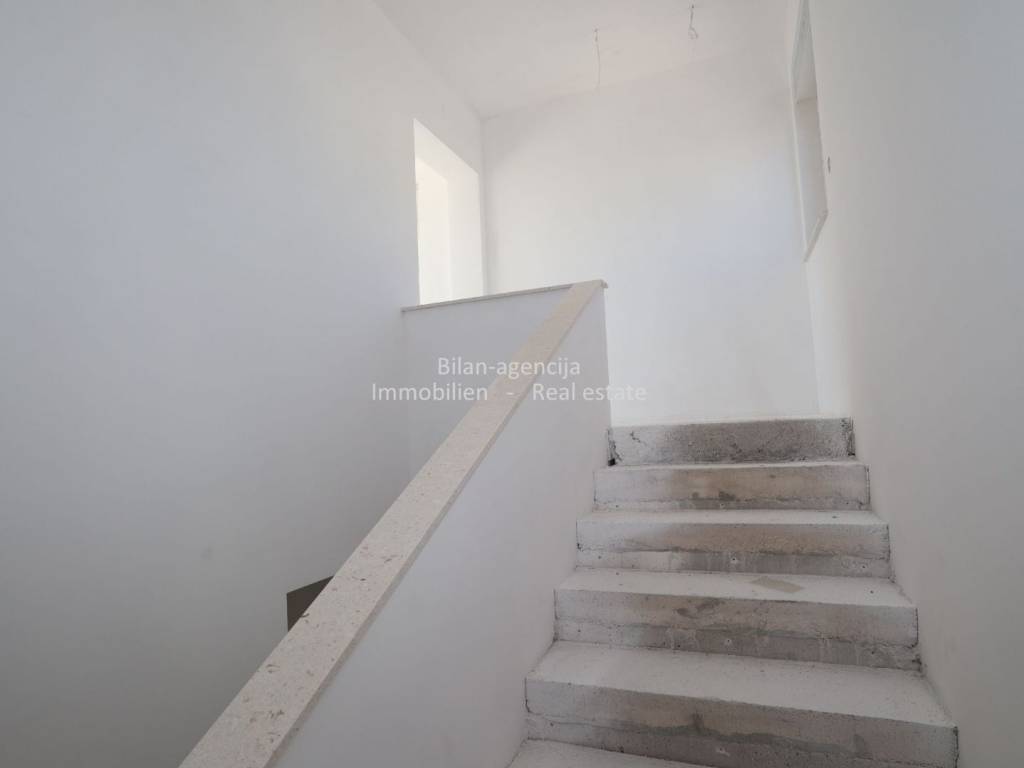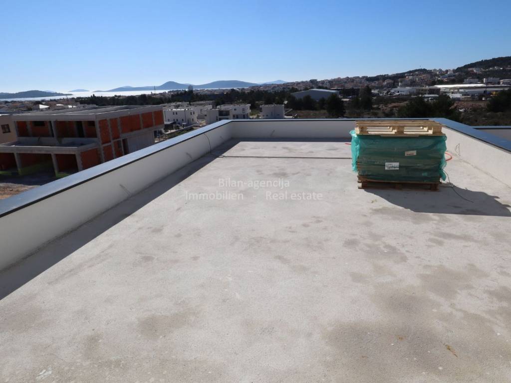 The apartment consists of a kitchen-dining room-living room, bathroom, additional toilet, 2 bedrooms, one covered terrace and stairs. On the flat roof there is a summer kitchen and dining room, toilet, covered and uncovered terrace with a view of the city of Vodice, the sea and the islands.