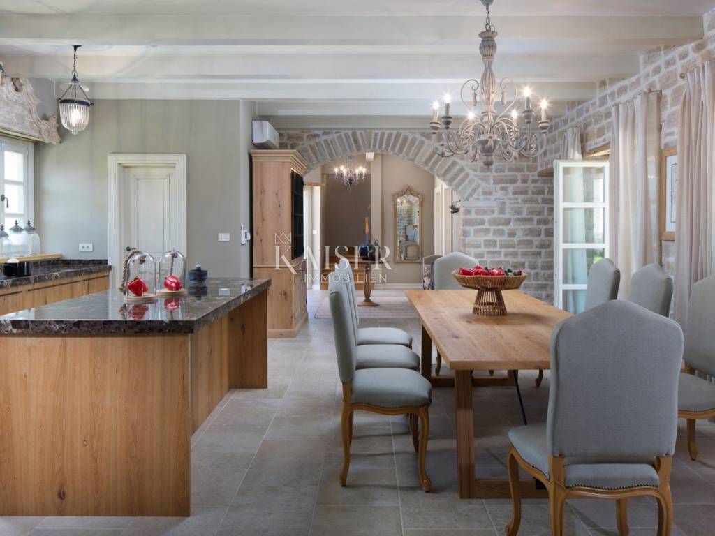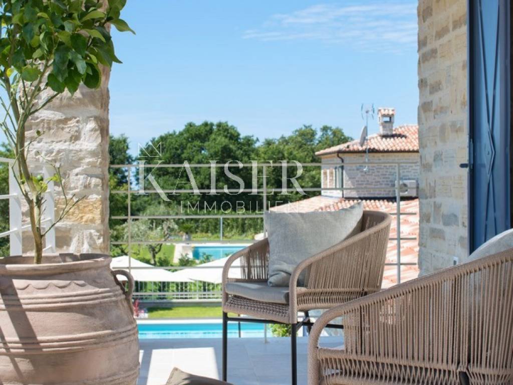 Kaiser Immobilien is putting on the market a luxury villa with a pool of 353 m2 on two fully air-conditioned floors with a capacity of 8 people. On the ground floor there is a spacious living room with a fireplace, a dining room with a table and chairs for 8 people, a fully equipped rustic kitchen, a bedroom with a double bed and a bathroom. There are three double rooms with bathrooms on the first floor. Two have a double bed, and one has two separate beds. Two rooms have access to terraces with an enchanting view of green landscapes, pastures where Istrian Boškarini cattle graze and the sea on the horizon. Luxurious and designer-furnished villa, with its own garden and swimming pool with hydromassage corner, located on the edge of the village of Ladići near Kanfanar, 23 km from Poreč and 26 km from picturesque Rovinj. The villa is luxuriously equipped and furnished with rustic furniture in the style of a castle, offering its guests a very high level of comfort, while the balcony on the first floor of the house offers a beautiful panoramic view of the sea. The villa has common facilities that represent a unique offer for this type of holiday home in Istria, consisting of 2 tennis courts, a multi-purpose playground for basketball, volleyball and indoor soccer, a bowling alley, outdoor fitness, a children's playground and a garden where the guests of the house they can pick organically grown vegetables. All the listed facilities are of course included in the price. The fenced and closed sports residential complex covers an area of 5600 m2. All courts have lighting so that they can be used at night. The complex consists of: - ecological garden - landscaped area with equipment - landscaped children's playground - two tennis courts - two bocce courts - handball court - basketball court - court for volleyball - outdoor fitness
