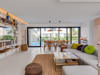 The open-plan living area seamlessly connects to the private garden and terrace, just steps away from the saltwater pool. Designed for outdoor living, the garden features sun loungers, an outdoor shower, a dining table for eight guests and a fully equipped outdoor kitchen with an electric grill—perfect for relaxed Mediterranean evenings.