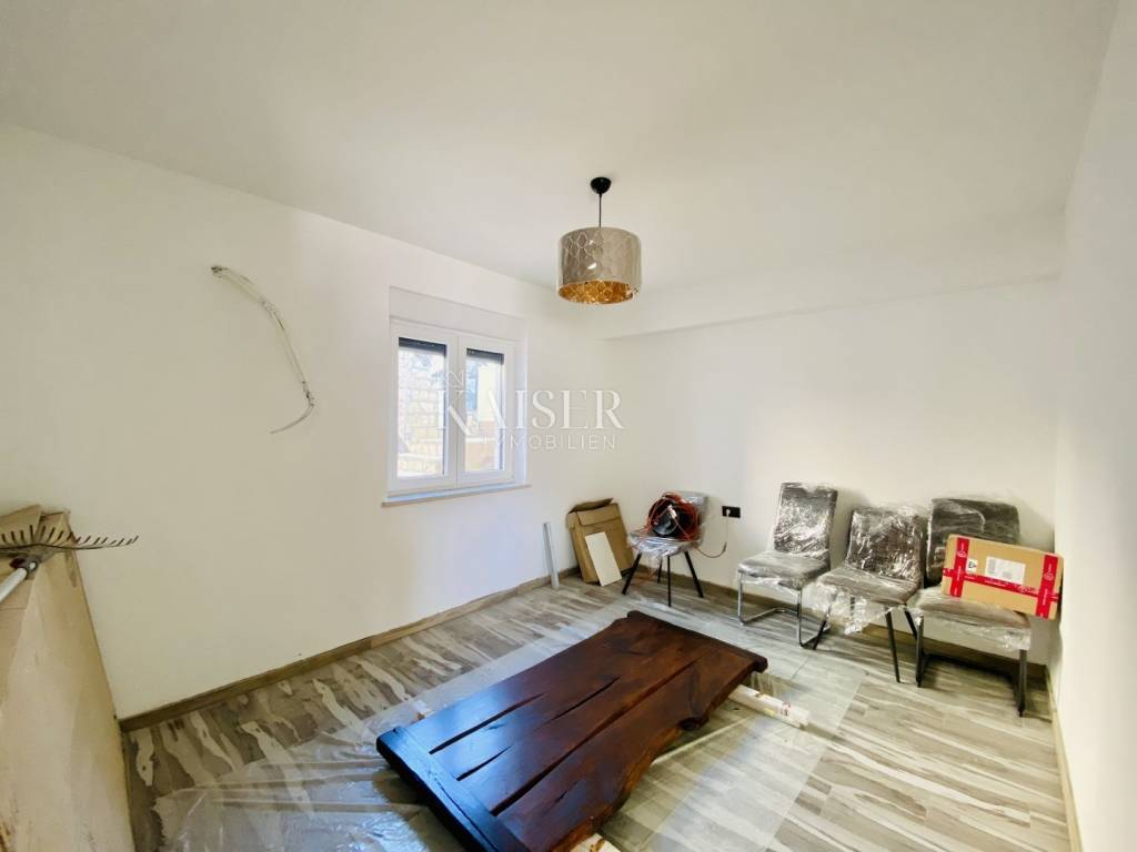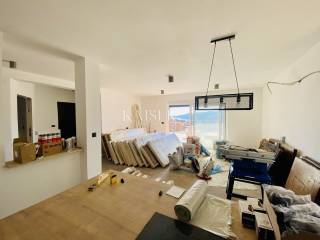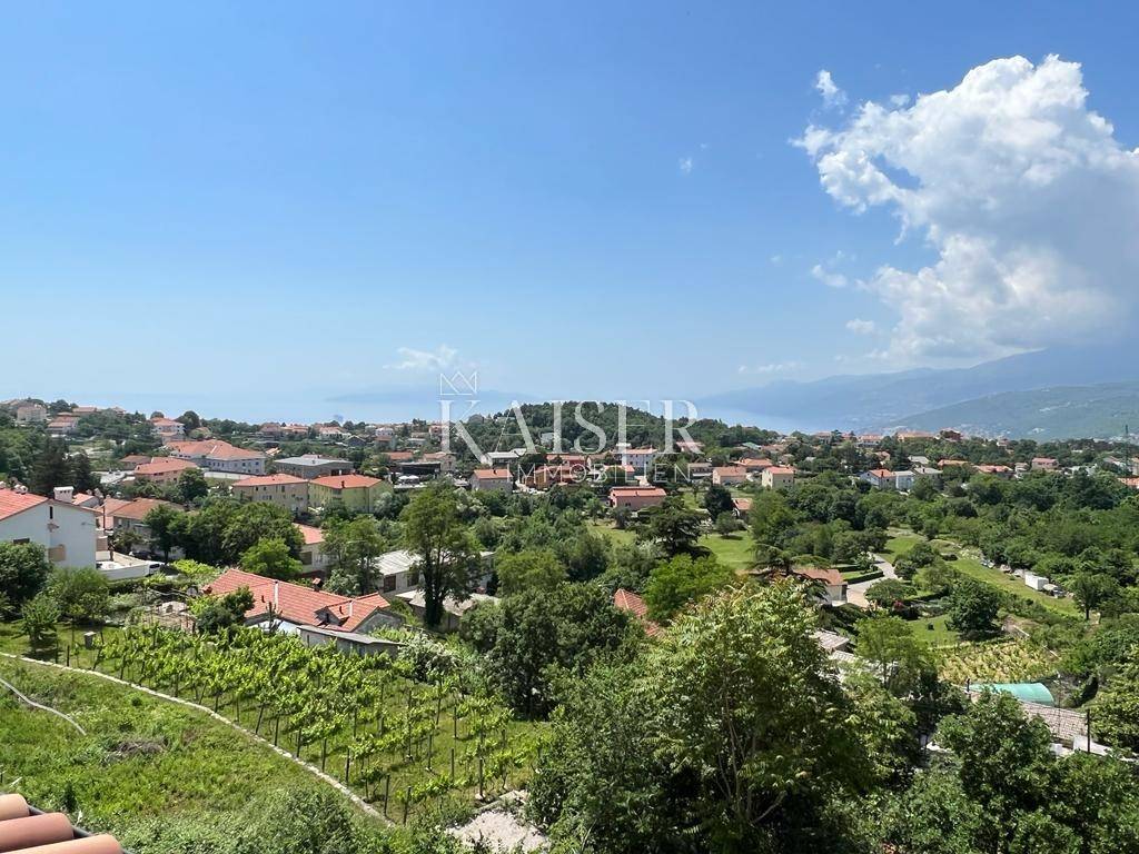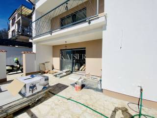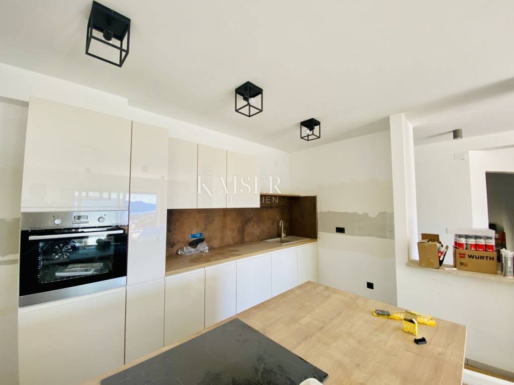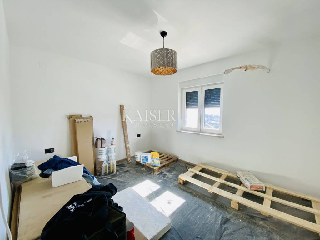 Kaiser Immobilien presents a two-room apartment with a garden and a beautiful view of the sea in a high-quality new building with a total of 3 residential units in an excellent location in Belići, near the center of Kastav. The apartment is located on the upper ground floor and consists of a double living room with a kitchen and dining room, 2 bedrooms, a bathroom and a terrace of 40 m2. The total net area of the apartment is 84 m2. The entire property is of high quality (ceramics, sanitary ware, underfloor heating via a heat pump, air conditioners, etc.). The long view is aimed at the sea, the Kvarner islands, Opatija and Učka. The apartment has a garden of 100 m2, a woodshed of 6 m2 and 2 parking spaces.