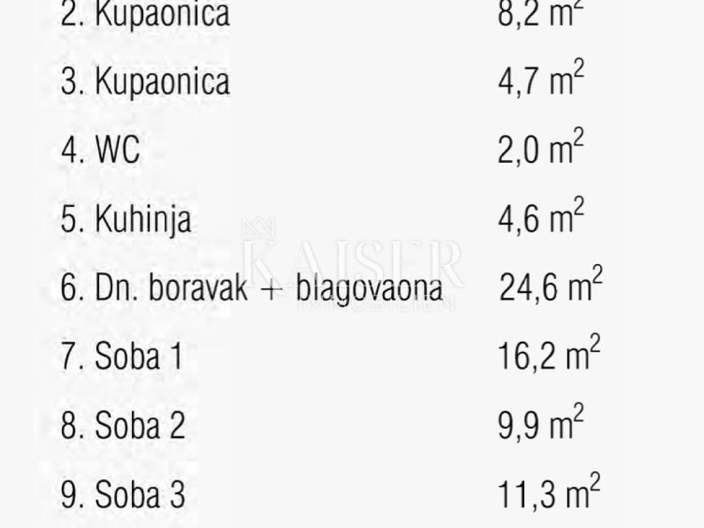 Kaiser Immobilien Exclusively markets a new project in Martinkovac. We present a wonderful apartment with a net area of 109.3m2 (total area = 113m2). The apartment has three bedrooms with a living room, it is equipped with two bathrooms and a separate toilet, in which floor heating is installed, while the entire apartment has a heating, air conditioning and ventilation system. The apartment is located in a modern residential building with an elevator, north-west and south orientation. The apartment has two covered parking spaces and a storage room. The buyer does not pay real estate tax. The expected completion of the works and occupancy is in 2024. For more information, contact with confidence.