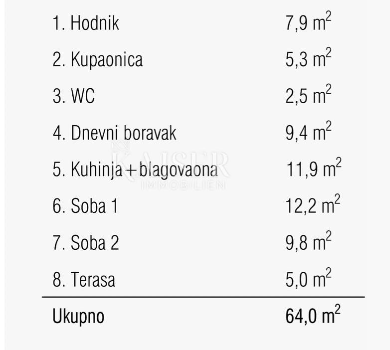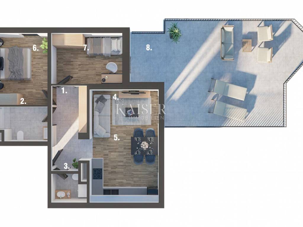 Kaiser Immobilien Exclusively markets a new project in Martinkovac. We present a wonderful apartment with a net area of 64.0m2 (total area = 66.30m2). The apartment has two bedrooms with a living room, it is equipped with a bathroom and a separate toilet, in which floor heating is installed, while the entire apartment has a heating, air conditioning and ventilation system. The apartment is located in a modern residential building with an elevator, north-east orientation. The apartment has a garden area of 44.0m2, as well as one covered parking space and a storage room. The buyer does not pay real estate tax. The expected completion of the works and occupancy is in 2024. For more information, contact with confidence.