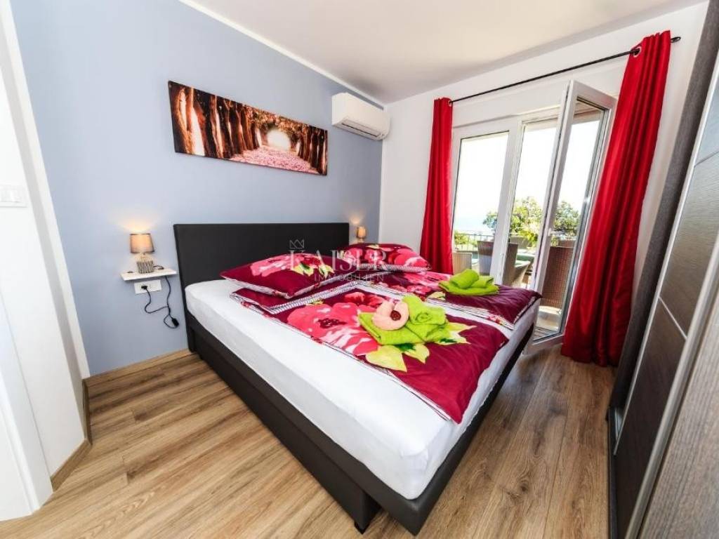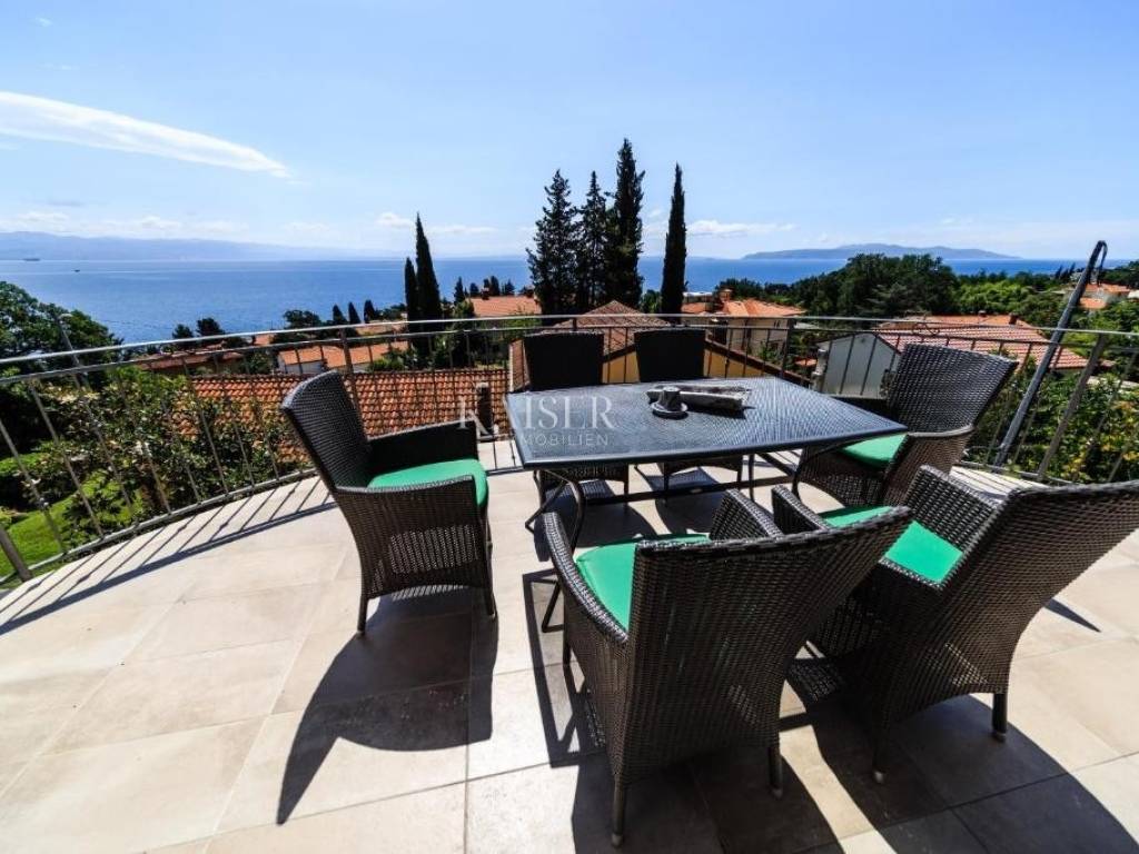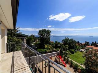 Kaiser Immobilien presents you a beautiful Villa only 150 meters from the sea with a beautiful sea view. The villa has on the first floor a large apartment with 3 bedrooms, three bathrooms, a kitchen, a living room and a beautiful terrace with an open view of the sea. The villa has a direct entrance from the garage on the first floor. On the second floor is a spacious apartment with three bedrooms. rooms, three bathrooms, kitchen, living room and terrace with beautiful sea view. The villa has a tavern on the ground floor with a decorated fireplace, a room for jacuzzi and relaxation and one small toilet. On the ground floor there is another small apartment of 30 m2 that can accommodate two people. In the yard there is a spacious swimming pool of 32 m2. The pool has automated dosing of salt and chlorine, as well as complete preparation for installation of pool heating. The house has water heating and a boiler for solar heating and preparation for a heat pump for solar heating. The boiler room has been prepared for pellet central heating. The complete villa is under video surveillance. The villa has the possibility to use its own cistern. The villa has two parking spaces in the garage, two covered parking spaces and another uncovered parking space. The nearest beach, bus stop, shop and restaurant are just a five-minute easy walk away. Nearest airports Rijeka airport 24 km Pula airport 52 km Portorož airport 55 km