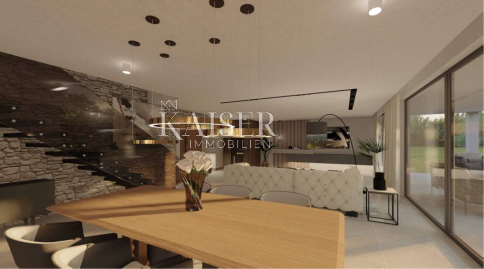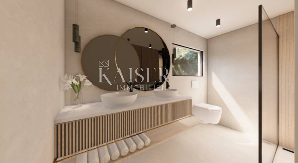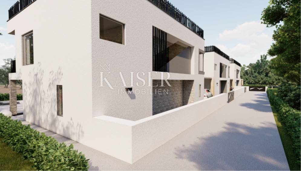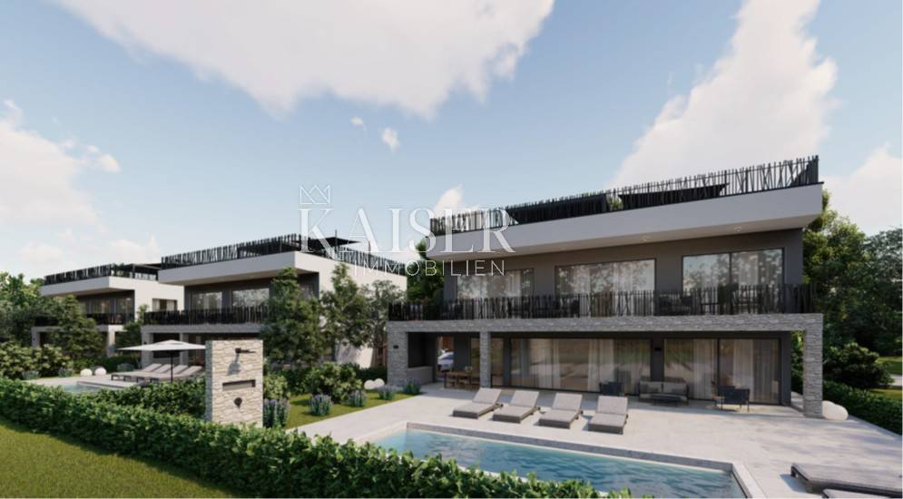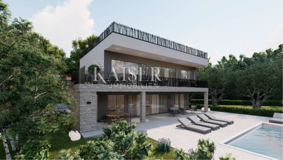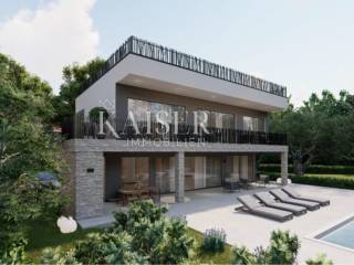 Kaiser Immobilien puts on the market a new exclusive villa only 200 m from the sea. This beautiful new modern unique villa is located on the northwestern coast of Istria in the city of Poreč. It is only a few km from the center of Poreč. The villa is located on the coastal side of the city of Poreč, not far from the beach. The villa is spread over a plot of 1502 m2 and was built as part of two other identical neighboring villas, connected as duplexes. The villa consists of a ground floor and a first floor and a decorated roof with its contents such as a jacuzzi, sunbeds and a corner sofa to enjoy an additional superb view of the sea, the city of Poreč and the vineyards and olive groves on the other side. On the ground floor of the villa there is a kitchen, dining room and living room, an outdoor kitchen, an outdoor dining terrace and a small toilet. On the first floor there are 3 bedrooms with their own bathrooms, one of those three bedrooms is a master bedroom with its own master wardrobe and master bathroom. There is also a beautiful covered balcony with a view of the pool that stretches along the entire length of the villa. The special feature of this villa, apart from the fact that it is located 200 m from the beach, is that the villa is equipped with top quality materials, a very modern design with a small addition of indigenous traditional style unique to this part of Istria. Very important note, for now there are 3 such identical houses, duplexes, in the project, however, a very important fact is that the project can be changed according to the customer's wishes, even to the extent that there can be 2 identical houses or even one on the same land. There are possibilities of carrying out works in different aspects according to the wishes of our customers. Each villa will have 2 covered parking spaces and an asphalt access road. If you want this beautiful new unique villa to become your new home, not far from the sea, contact your agent.