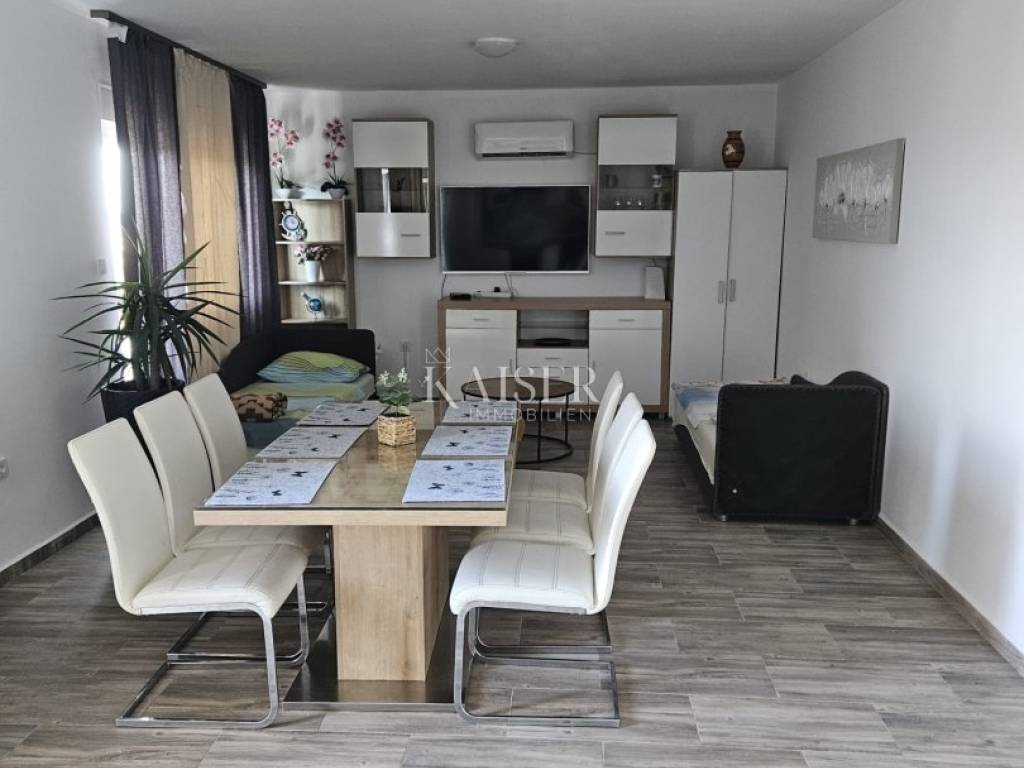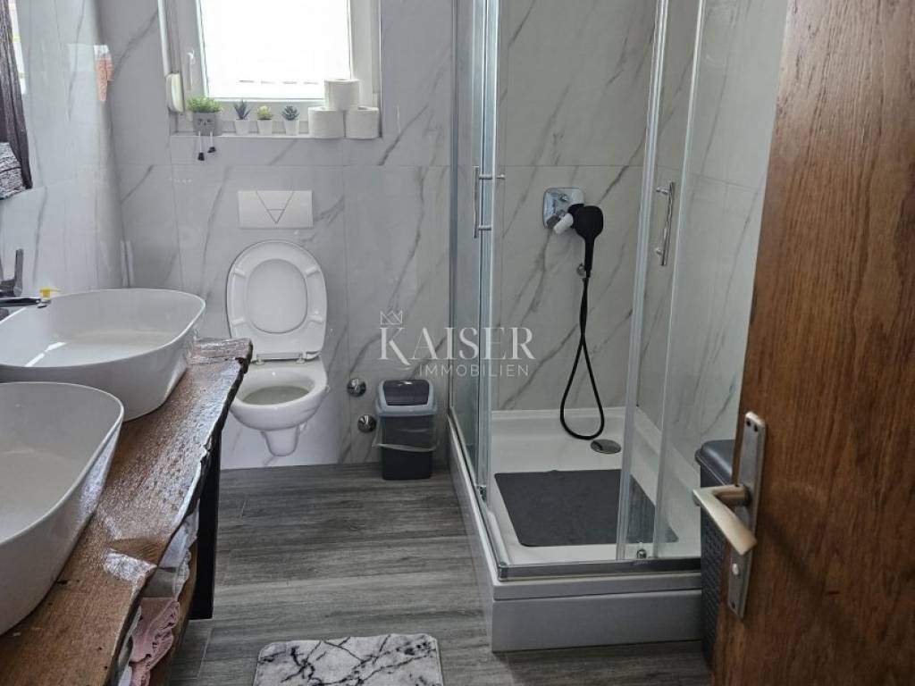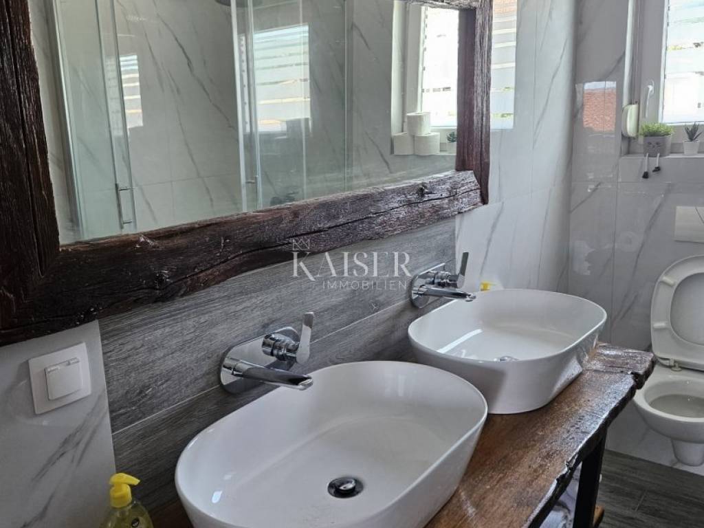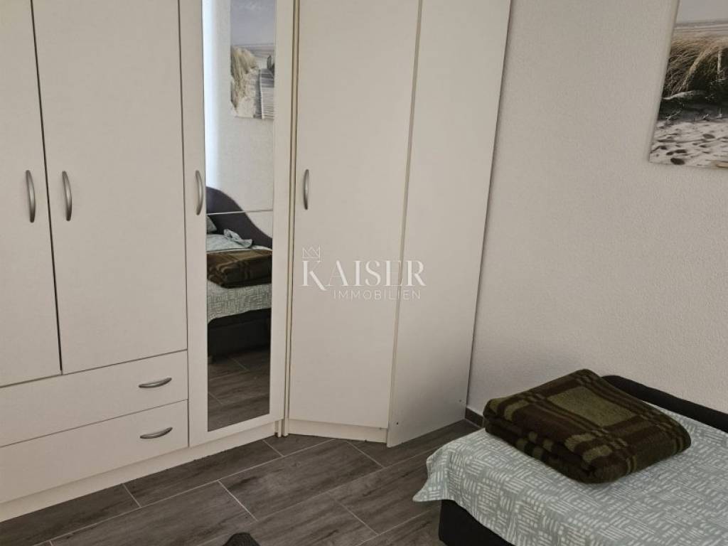 Kaiser Immobilien presents a beautiful two-bedroom apartment for monthly rent for a minimum period of one year. The apartment is located in the near center of Novi Vinodolski in a quiet street and is located on the second floor of the house. The apartment has 90m2 and consists of two bedrooms, a living room with kitchen and dining room, bathroom, and balcony. The apartment was completely renovated in 2024 and has air conditioning heating and cooling. From September of this year, it will also have wood-fired central heating, which will connect the entire house and all apartments from a common boiler room. The apartment is still undergoing some modifications to the furniture. The apartment has been briefly used as a tourist rental until now. For any questions, please feel free to contact the agent: Davor Piškulić davor@kaiser-immobilien.hr +00 385 95 583 8240 WhatsApp, Viber