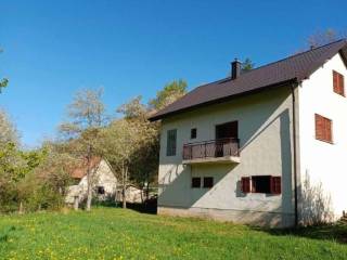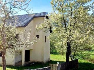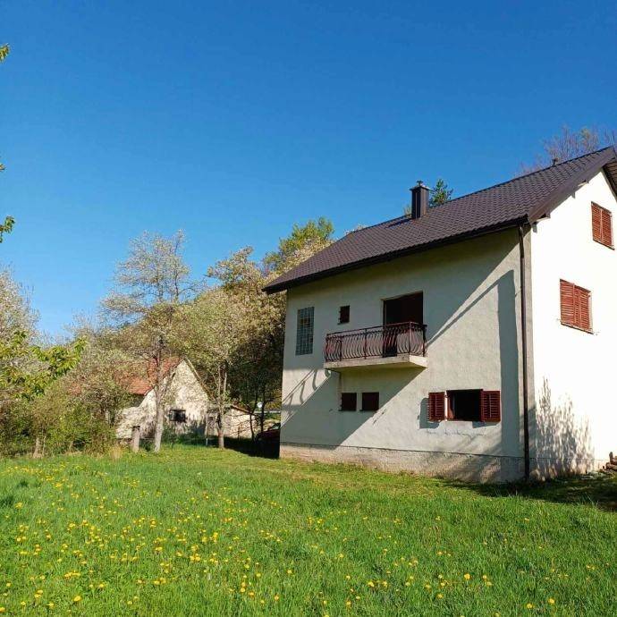 The spacious and landscaped yard includes a fruit orchard, barbecue area, wooden shed, space for a winter terrace, and parking for several vehicles. The house has asphalted access, is connected to the city water supply and sewage system, and is heated via a wood-burning stove. The location offers complete privacy, peace, and natural surroundings, while being only 10 minutes from Gospić and the highway, and 30 minutes from the coast (Karlobag).