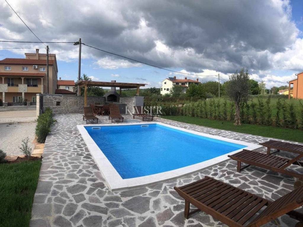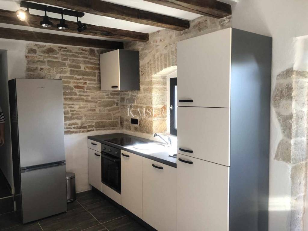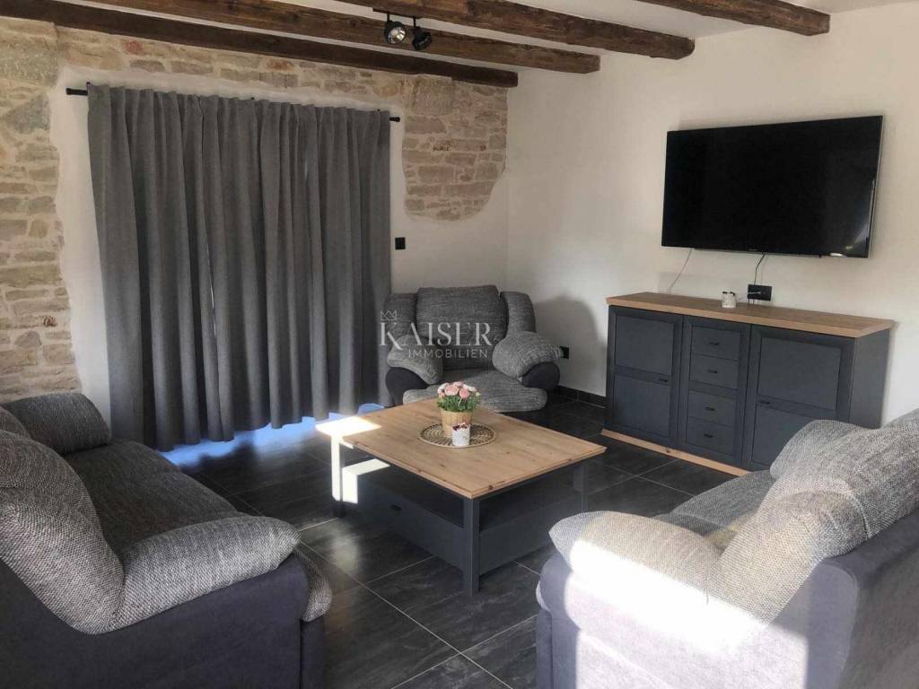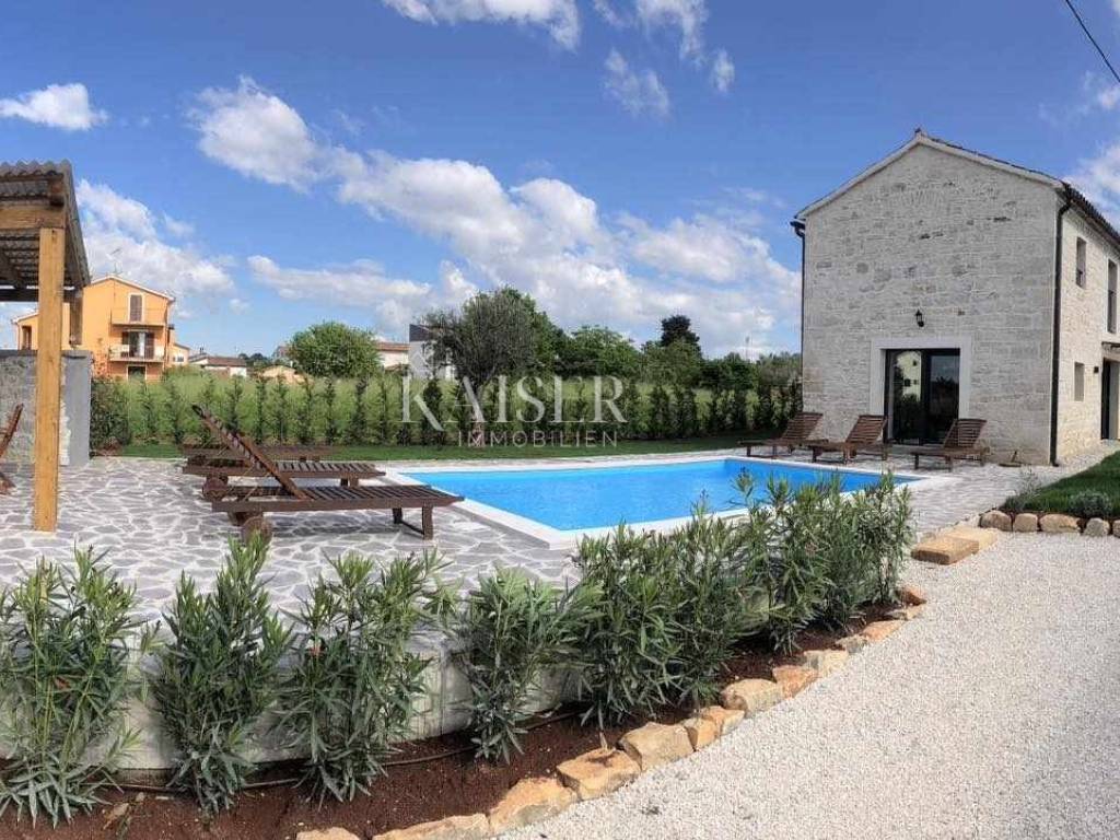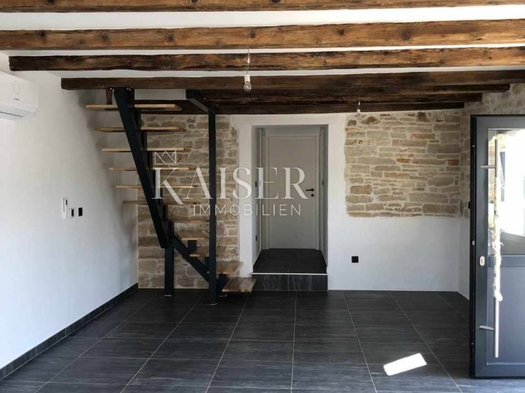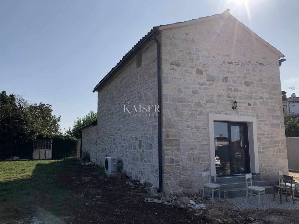 Kaiser Immobilien presents a beautiful stone house, adapted in true Istrian style. The house is a combination of the past and the present, a combination of the autochthonous original appearance of former Istrian houses and the modern design that prevails today. This beautiful original house is located only 8 km from the city of Poreč and the first beaches. It is located in a small place that is very quiet and offers a comfortable and safe life. This beautiful renovated house consists of a ground floor and a first floor. On the ground floor there is a living room, kitchen and dining room, one bedroom and a bathroom. There is also one technical additional smaller room that can also be used as a storage room. On the first floor there are two more bedrooms with modern bathrooms. The charm of this house is the old stone walls of the past and the wooden beams on the ceiling, which give a special touch to the appearance of the house. The beams are original, but they have been redecorated and varnished and fit beautifully into the environment. In the yard of the house there is a swimming pool, 6x4, next to which there is a raised stone wall, thus providing complete privacy in the yard. There is also a summer outdoor kitchen that will brighten up your summer evenings and gatherings during warm summer days. The entire house was newly adapted at the beginning of 2023, and will be completely finished at the end of 2023. The interior of the house is already finished, ceramics, carpentry and sanitary ware, electric underfloor heating, mesh system, each bedroom has its own air conditioner. The pool and yard are just being finished. The size of the house is 133 m2, and it is located on a plot of 538 m2. This house is an ideal opportunity for a peaceful daily life in a quiet neighborhood or it can be used as an investment in terms of renting, given its geographically popular position. If you want this beautiful renovated villa to become your new home, contact the Kaiser Immobilien Poreč agency.