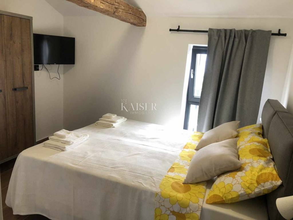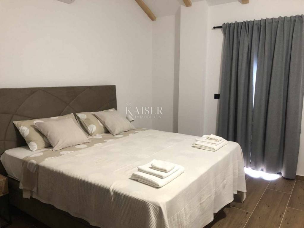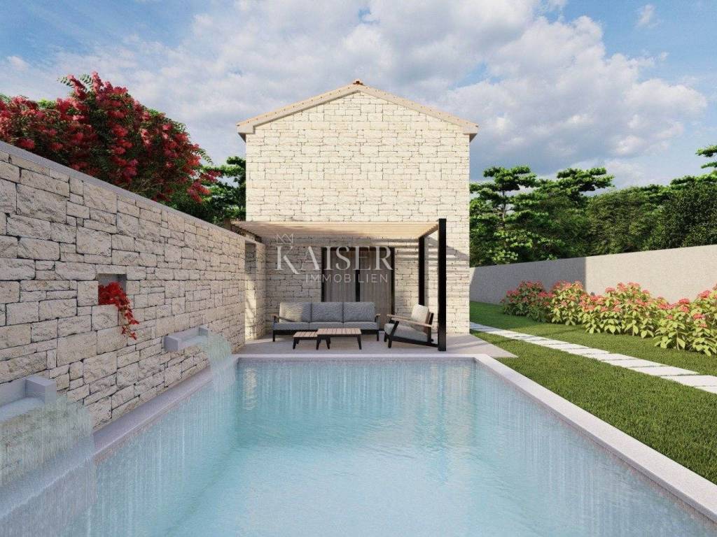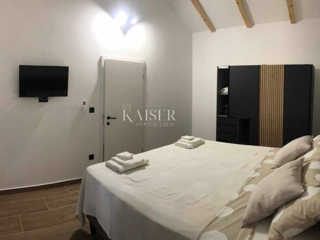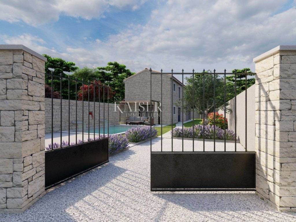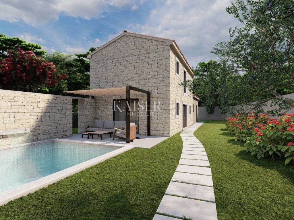Kaiser Immobilien presents a beautiful stone house, adapted in true Istrian style. The house is a combination of the past and the present, a combination of the autochthonous original appearance of former Istrian houses and the modern design that prevails today. This beautiful original house is located only 8 km from the city of Poreč and the first beaches. It is located in a small place that is very quiet and offers a comfortable and safe life. This beautiful renovated house consists of a ground floor and a first floor. On the ground floor there is a living room, kitchen and dining room, one bedroom and a bathroom. There is also one technical additional smaller room that can also be used as a storage room. On the first floor there are two more bedrooms with modern bathrooms. The charm of this house is the old stone walls of the past and the wooden beams on the ceiling, which give a special touch to the appearance of the house. The beams are original, but they have been redecorated and varnished and fit beautifully into the environment. In the yard of the house there is a swimming pool, 6x4, next to which there is a raised stone wall, thus providing complete privacy in the yard. There is also a summer outdoor kitchen that will brighten up your summer evenings and gatherings during warm summer days. The entire house was newly adapted at the beginning of 2023, and will be completely finished at the end of 2023. The interior of the house is already finished, ceramics, carpentry and sanitary ware, electric underfloor heating, mesh system, each bedroom has its own air conditioner. The pool and yard are just being finished. The size of the house is 133 m2, and it is located on a plot of 538 m2. This house is an ideal opportunity for a peaceful daily life in a quiet neighborhood or it can be used as an investment in terms of renting, given its geographically popular position. If you want this beautiful renovated villa to become your new home, contact the Kaiser Immobilien Poreč agency.