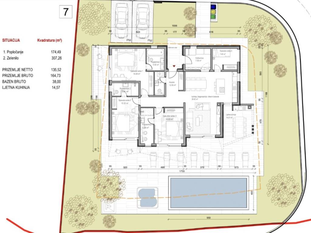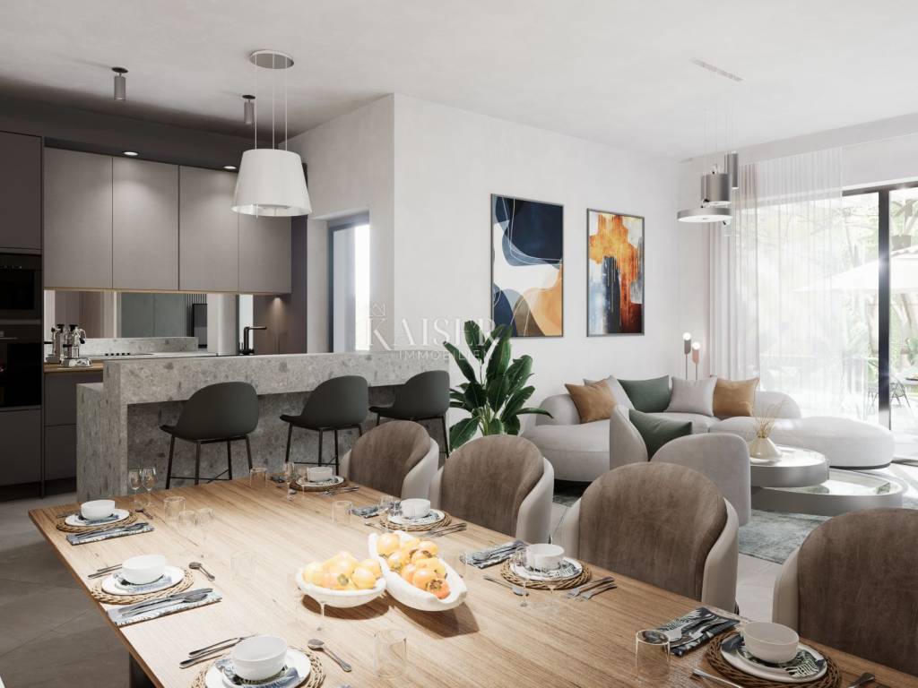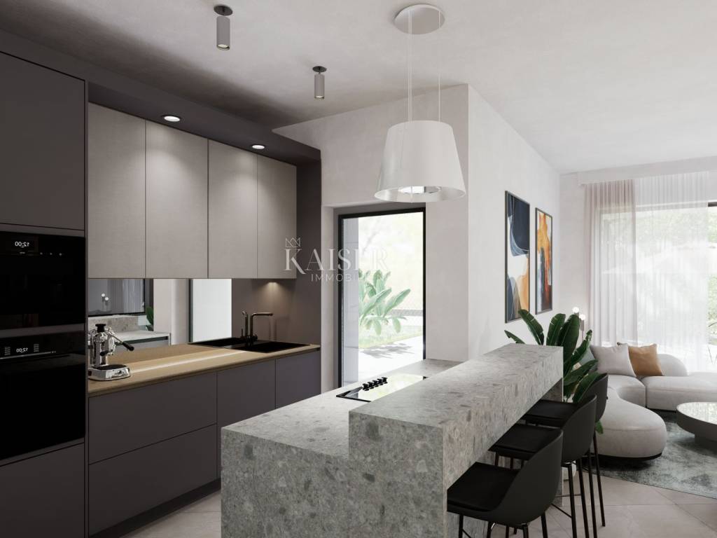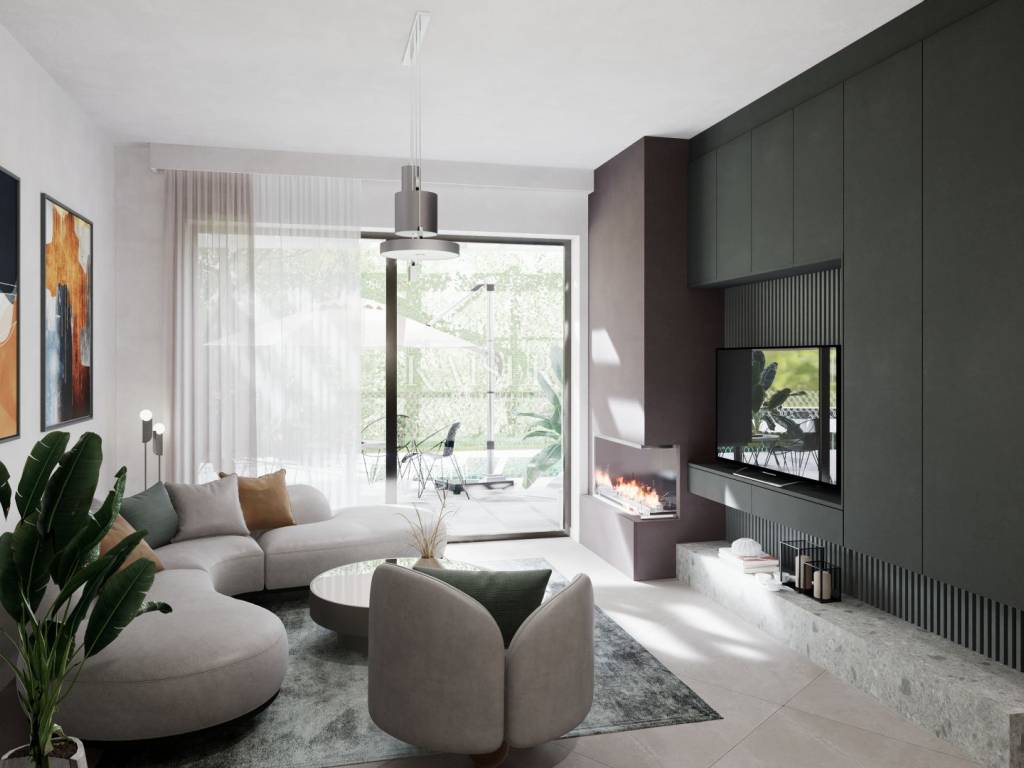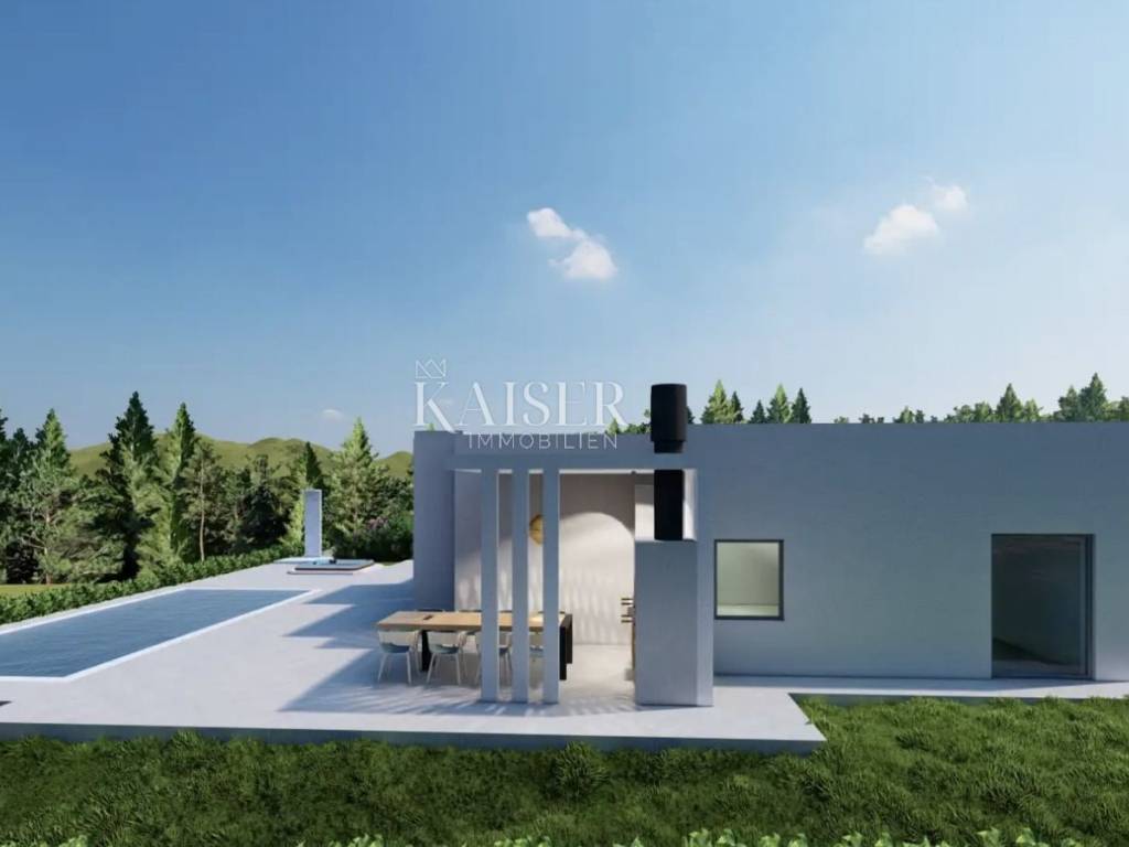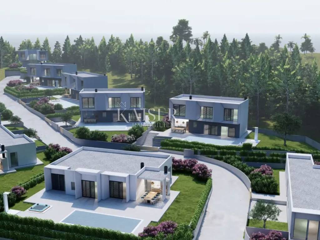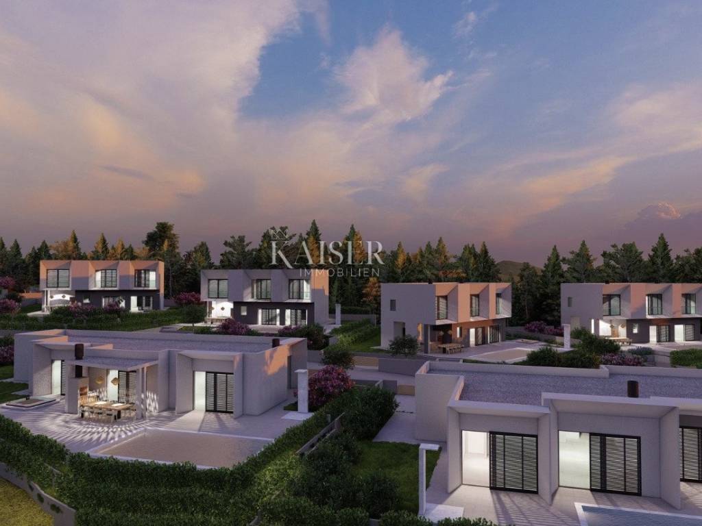 Kaiser Immobilien presents a unique opportunity to buy a new building with a swimming pool just two kilometers from the sea. The property consists of 158 m2 of living space. Used as four bedrooms and three bathrooms. The rooms are spacious, have their own air conditioners and underfloor heating. The open space for socializing consists of a kitchen with a dining room and a living room, the space is separated from the pool's sunbathing area by glass walls. The spacious garden (718 m2) offers a swimming pool with a sun deck that offers a view of nature and the sea. Aromatic herbs and other decorative trees will be planted to provide even greater privacy. The property is part of a newly built complex of villas with a private road. Start of works in 2025. The investor offers the possibility of tourist rental and maintenance of the property. Quick and safe return on investment or a great family home. Excellent year-round and tourist location. The first beaches and the sea are only a three-minute drive away, while the city center is 20 minutes away. For more information, contact an agent. Ana Beović +385 91 618 3332 ana@kaiser-immobilien.hr