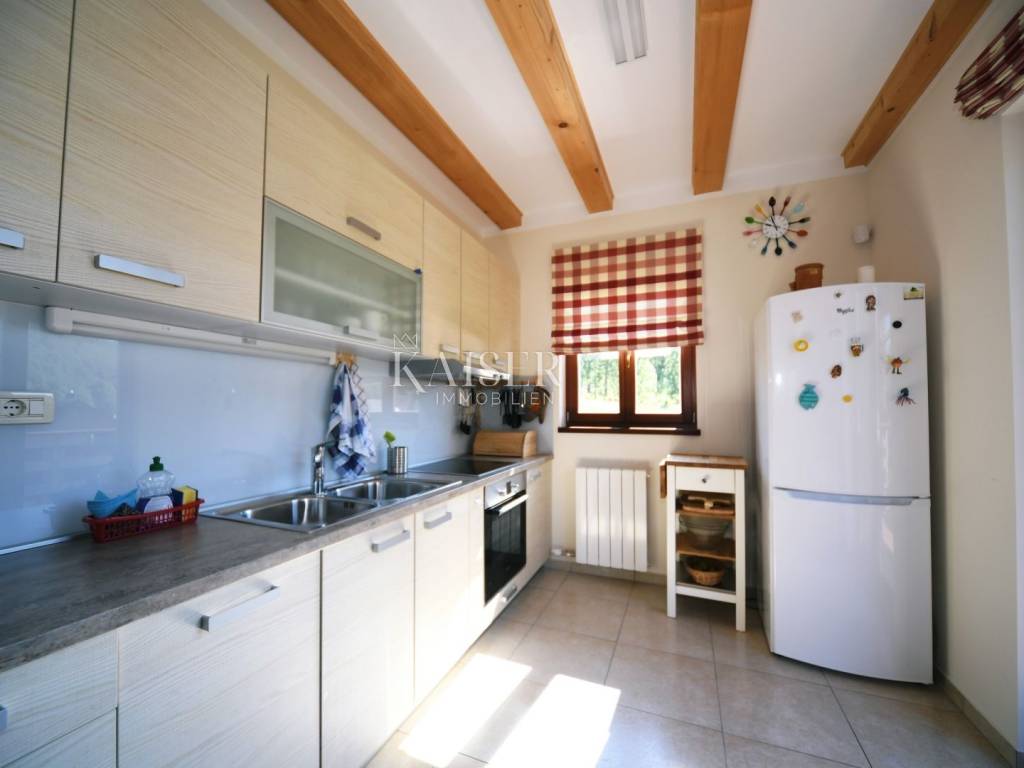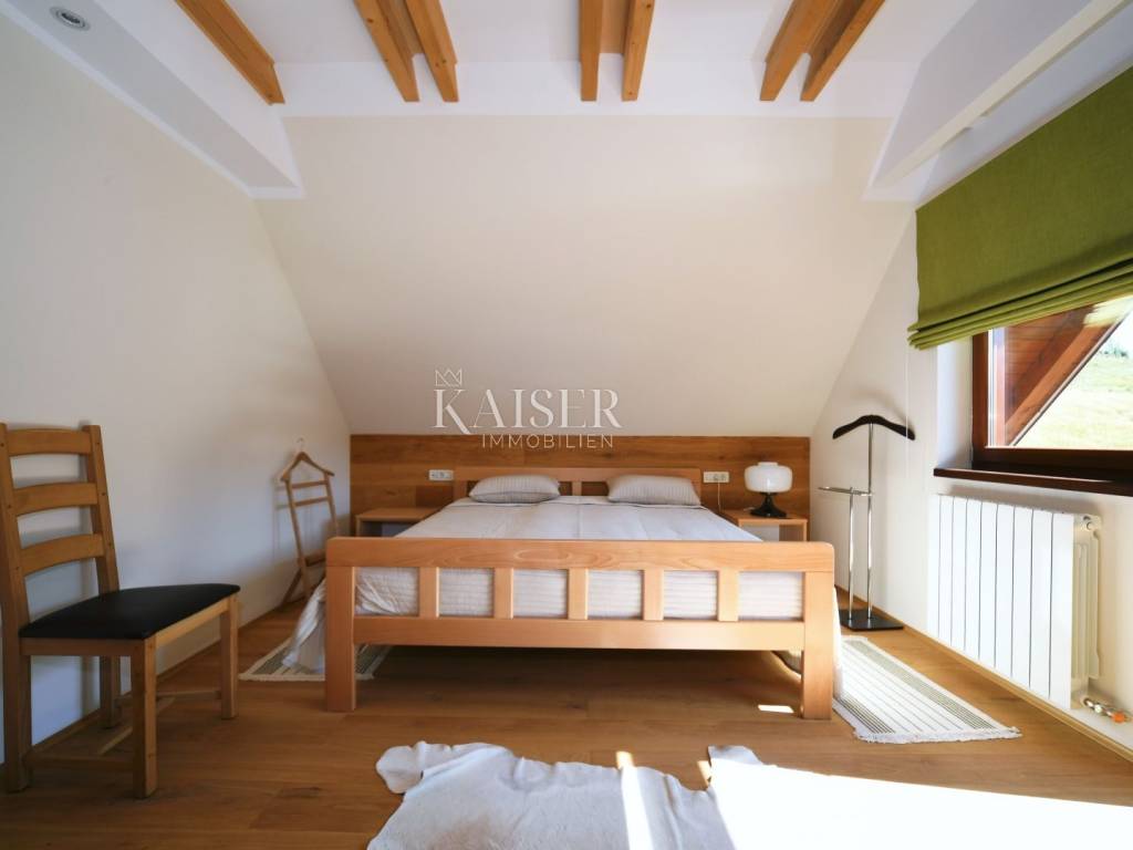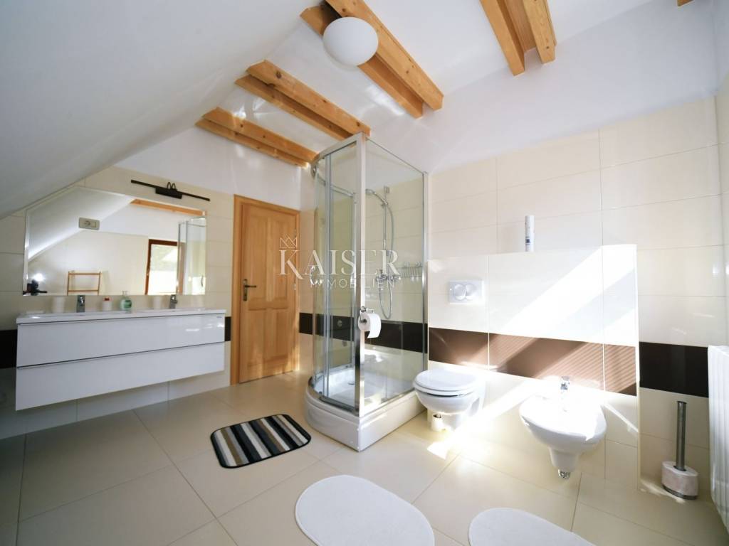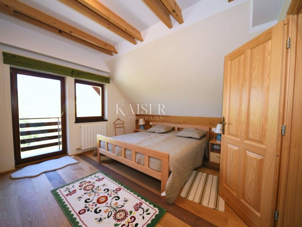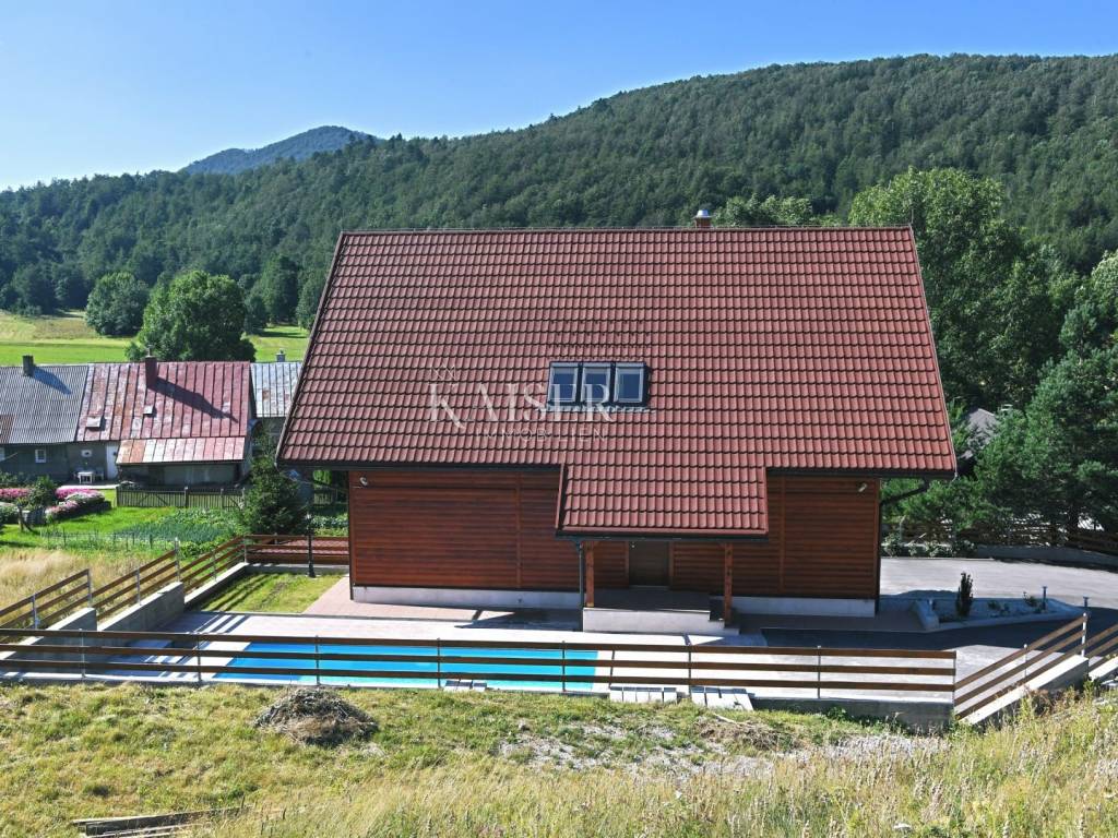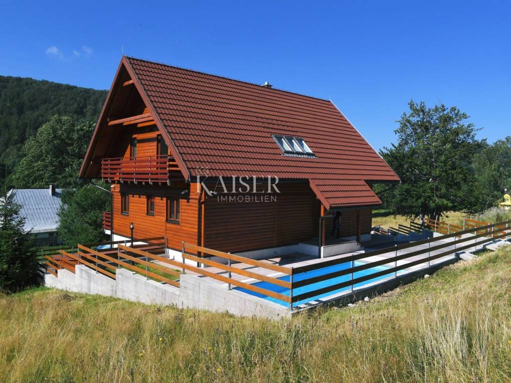 Kaiser Immobilien has the opportunity to present you a beautiful wooden house, located in a famous tourist destination in Gorski kotar. The house consists of a ground floor and two floors. On the ground floor there is a tavern with an open fireplace, kitchen, bar, bathroom and sauna. Internal stairs lead to the first floor, where there is a spacious living room with fireplace, kitchen and dining room, bedroom and bathroom. On the second floor there are three bedrooms with bathrooms, and one part is a work area. The property includes a beautifully landscaped garden with a 30 m2 swimming pool with a protective dome, five parking spaces and a garage. The property is very bright and sunny, and the surroundings and the view are of nature, forests and greenery. This property is equipped with all the elements necessary for living and enjoying. The documentation is in order. Feel free to contact your agent.