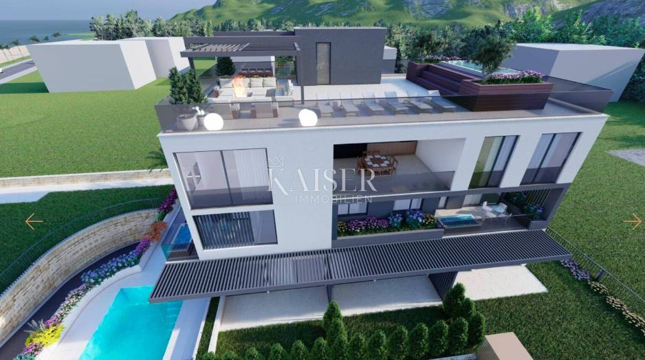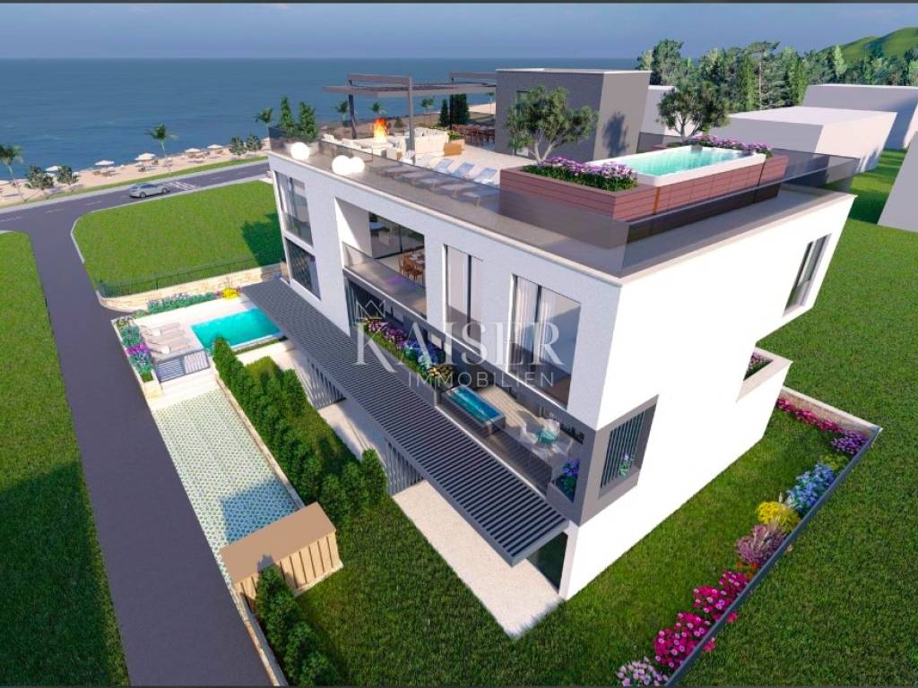 Located in an elite location near the sea, within a luxury complex, is the exclusive penthouse S201. This modern new building offers only a few apartments, ensuring intimacy, privacy and top quality living. With its contemporary architecture, luxurious layout and proximity to the sea, this residence provides a unique opportunity to enjoy the Mediterranean lifestyle, with spectacular panoramic views and a peaceful, relaxing atmosphere. About the complex The complex consists of a total of three modern buildings, within which there are several exclusive apartments. One of the greatest advantages of this complex is the communal swimming pool, available to all residents. The pool is an ideal place to relax during warm days, but also to socialize with family and neighbors. Located in the central part of the complex, it is surrounded by landscaped green areas that further contribute to the feeling of privacy and peace Penthouse – the pinnacle of elegance and luxury Luxury penthouse apartments represent the pinnacle of elegance and luxury. Spacious private terraces offer unobstructed panoramic views of the sea, while the interior spaces exude superior aesthetics and sophisticated design. This penthouse offers an exceptional level of privacy thanks to its own internal staircase, allowing easy access to the upper floors without the need to use common areas. Spacious and luxurious interior Apartment S201 has a net area of 249.10 m2, while the gross area is 405.78 m2. The cleverly designed layout allows for comfort and functionality for the whole family. Upon entering the apartment, you will be greeted by a spacious hallway (12.78 m2) that leads to a spacious living room with kitchen and dining area (68.96 m2). Large glass walls ensure plenty of natural light and create a seamless connection between the interior and the exterior. The apartment contains five rooms: • Master bedroom (18.06 m2) – a luxurious private space with its own en-suite bathroom (5.57 m2) • Bedroom 1 (11.64 m2) – ideal for guests or a work space • Bedroom 2 (13.59 m2) – spacious and comfortable • Bedroom 3 (12.36 m2) – perfect for a family • Additional room – a flexible space that can be adapted to the owner's needs The apartment also includes: • Bathroom 1 (4.25 m2) – modernly decorated • Bathroom 2 (5.57 m2) – an additional comfortable option • Toilet (3.45 m2) – a practical solution for guests • Laundry room (2.73 m2) – functional and discreet Outdoor spaces – loggia and roof terrace The penthouse comes with a spacious loggia (34.34 m2) and an impressive roof terrace (197.45 m2), ideal for enjoying the outdoors. The roof terrace, which additionally includes a staircase (12.40 m2), is designed as a private oasis with the possibility of installing a jacuzzi or an outdoor dining area. Shared pool and additional amenities The building's residents have access to a shared pool, which provides a superior experience of relaxation and enjoyment in the warm summer months. Top-quality construction and equipment The penthouse was designed with an emphasis on top-quality construction, modern architecture and maximum comfort. The highest quality materials were used to ensure durability and timeless elegance. The quality of construction and the selection of top-quality materials are key to the comfort, safety and energy efficiency of the living space. The building is insulated with a 10 cm layer of polystyrene, which ensures optimal thermal protection. Heating is solved by an underfloor system in the bathrooms, while air conditioning for heating and cooling is installed in other rooms. Three-layer PVC joinery provides excellent insulation, and all windows are equipped with electric shutters and mosquito nets for additional comfort. The security of the building is ensured by burglar and fire doors. The aesthetics and durability of the interior are complemented by top-quality ceramics. These modern technical solutions ensure a high quality of life and lasting value of the property. The building does not have secured parking spaces, but there is the possibility of purchasing a parking space in the underground garage, which provides additional convenience for apartment owners. Location - the perfect combination of privacy and urban life Apartment S201 is located in a prestigious location that offers the perfect balance between peace and accessibility to all necessary amenities. There are shops, restaurants, schools and promenades in the immediate vicinity. Sukošan - the perfect Mediterranean location Located on the Adriatic coast, Sukošan is known for its sandy beaches, crystal clear sea and top-notch gastronomic offer. This destination attracts lovers of peace, nature and luxurious life, and at the same time is located in the immediate vicinity of Zadar, which provides quick access to all urban amenities. A perfect opportunity for a dream home or a luxury investment. The agency commission for the buyer is 3% + VAT and is paid in the case of purchasing a property, upon conclusion of the first legal act. ID CODE: 128-39 For more detailed information, please contact: Tel: +385 955046197 E-mail: nina@kaiser-immobilien.hr