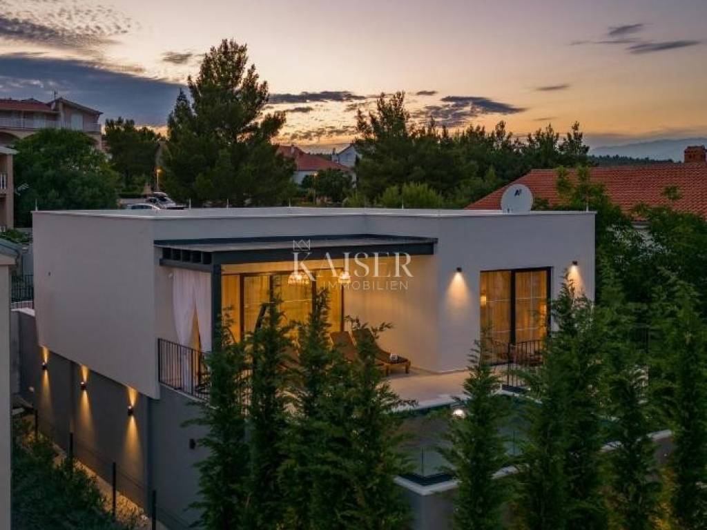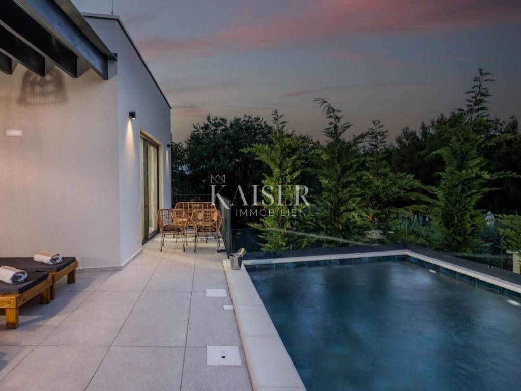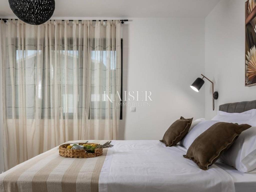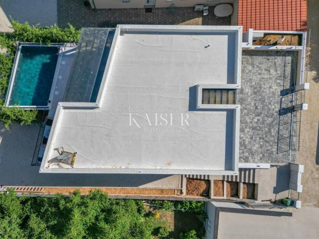 In a quiet and family-friendly village in Pridraga, not far from Zadar, a newly built modern villa of 220 m² is for sale, located in a prime location just a hundred meters from the sea. The villa is located in the second row to the sea and offers impressive sea views, peaceful surroundings and ideal conditions for living, vacationing or tourist rental. It consists of a basement and an upper floor. The basement is solidly built and is currently in the unfinished phase, which leaves the possibility of arranging it according to your own wishes. According to the preliminary design, it is designed as a space for a mini gym with space for a sauna, a hobby room and a technical room for maintaining the pool and garden, and there is also the option of converting part of the space into an additional apartment or wellness area, depending on the needs of the future owner. The first floor of the villa is made of high-quality prefabricated construction and is fully finished, modernly decorated and immediately ready for use. On the upper floor there is a spacious living room with an open-concept kitchen and dining room, from which you can exit through large glass walls to a large terrace with a 15 m² swimming pool and a sunbathing area. The villa has two spacious bedrooms, each with its own bathroom, an additional guest toilet and a functional storage/laundry room. The interior is equipped with designer furniture and top-quality appliances, and underfloor heating throughout the living area ensures comfort even during the colder months. The yard is landscaped and fenced, with a private driveway and parking spaces for two vehicles. The villa is a combination of modern design, functionality and top-quality equipment, and its additional value is given by its excellent location near the sea, in a quiet and developed place. The use permit is in the process of being obtained. This property is an ideal opportunity for those looking for a luxurious place to live on the coast or an excellent investment for tourist rentals with excellent return potential. The agency's commission for the buyer is 3% + VAT. The commission covers all services related to the purchase and is paid upon conclusion of the first legal act. If you want this beautiful house to become your new home or are looking for a property for business purposes in the form of a rental, please contact me at 00385 976839504, or at the email address: ilijana@kaiser-immobilien.hr Distance of the property from the place: Zadar Airport - 22 km Zadar - 38 km Novigrad - 8 km Bukva Beach - 350 m Pridraga is a picturesque and peaceful place located on the coast of the Novigrad Sea, near Zadar and the town of Novigrad. Known for its untouched nature, crystal clear sea and long pebble beaches, Pridraga is an ideal destination for those looking for an authentic Mediterranean atmosphere, away from the crowds and stress. This charming village exudes Dalmatian tradition and hospitality, and its position between the sea and the Velebit mountain provides the perfect balance between relaxation and outdoor activities. Whether you want to enjoy swimming, walks by the sea, cycling or exploring the surrounding natural beauty, Pridraga offers all this - and more. Pridraga has all the basic amenities for everyday life – shops, restaurants and basic infrastructure – while larger centers like Zadar and Novigrad are only a 20–30 minute drive away, offering additional amenities, historical sights and entertainment.