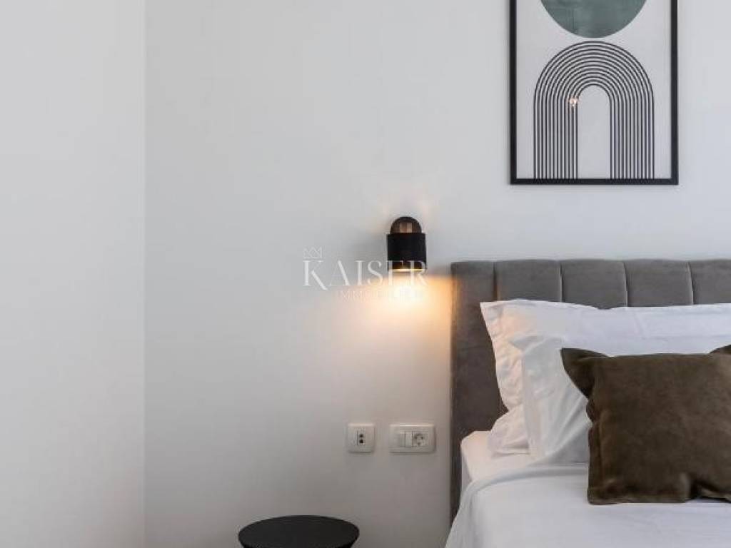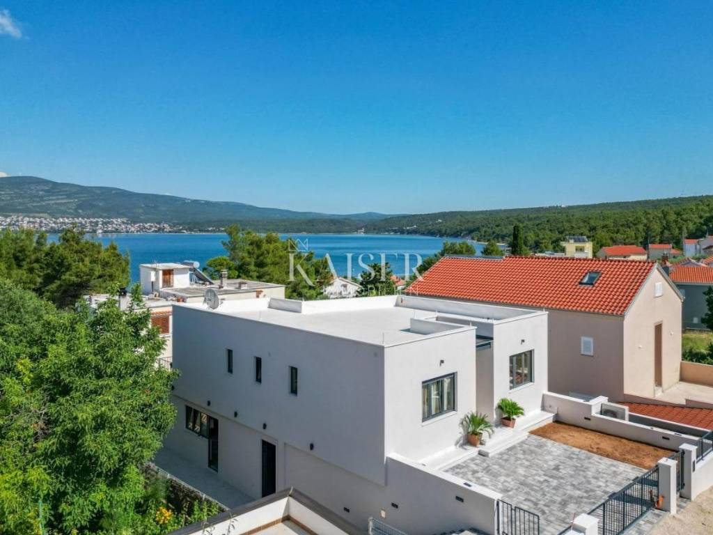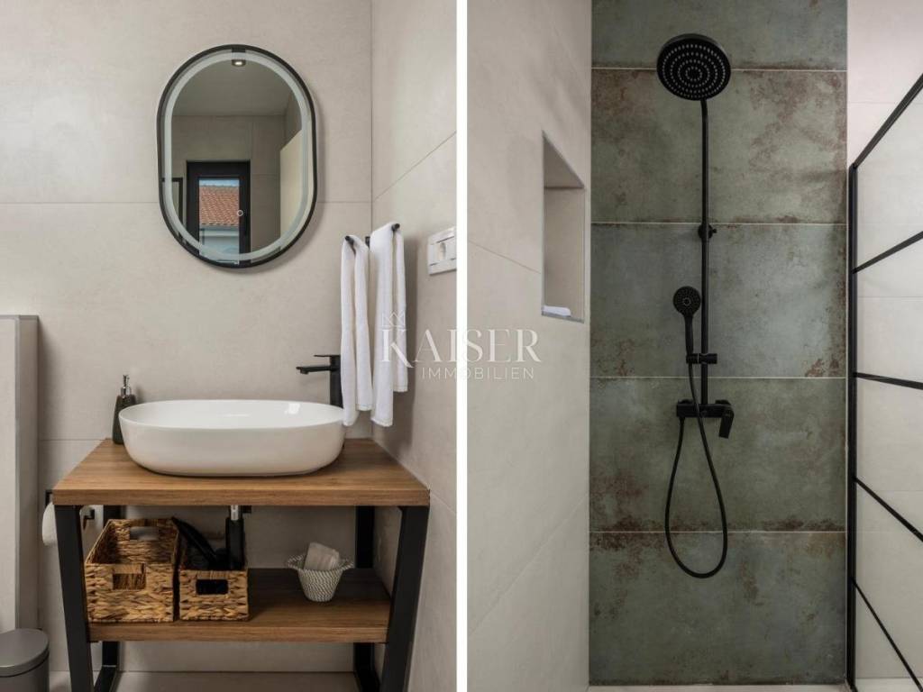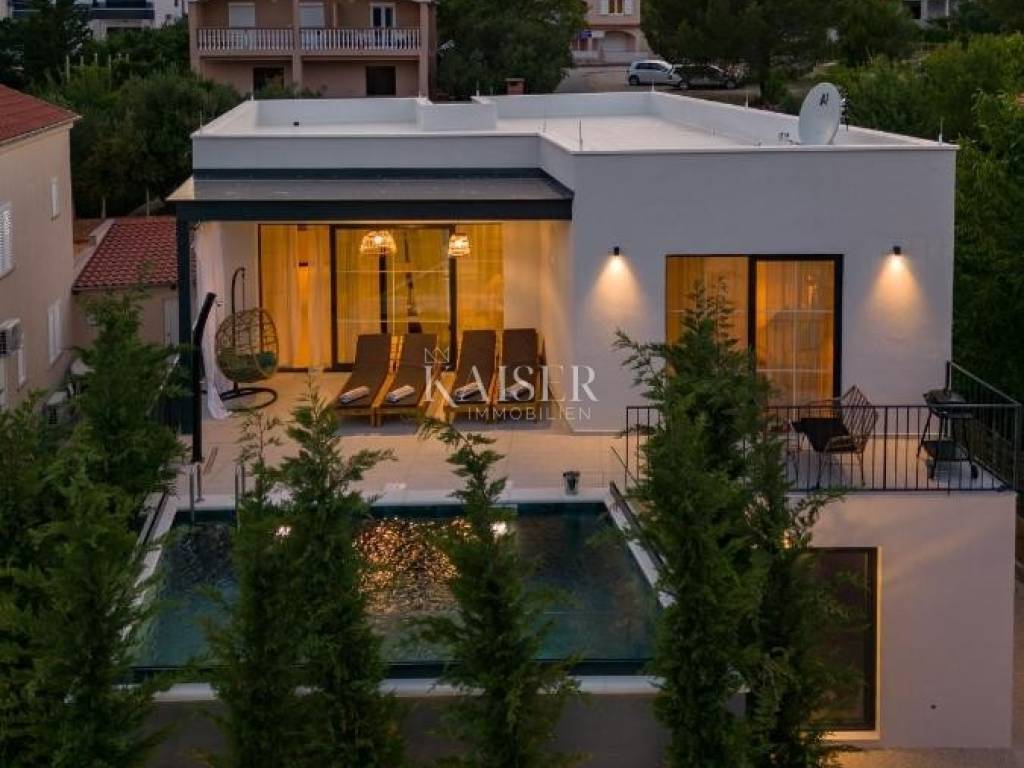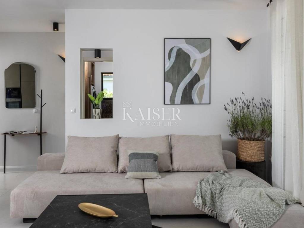 In a quiet and family-friendly village in Pridraga, not far from Zadar, a newly built modern villa of 220 m² is for sale, located in a prime location just a hundred meters from the sea. The villa is located in the second row to the sea and offers impressive sea views, peaceful surroundings and ideal conditions for living, vacationing or tourist rental. It consists of a basement and an upper floor. The basement is solidly built and is currently in the unfinished phase, which leaves the possibility of arranging it according to your own wishes. According to the preliminary design, it is designed as a space for a mini gym with space for a sauna, a hobby room and a technical room for maintaining the pool and garden, and there is also the option of converting part of the space into an additional apartment or wellness area, depending on the needs of the future owner. The first floor of the villa is made of high-quality prefabricated construction and is fully finished, modernly decorated and immediately ready for use. On the upper floor there is a spacious living room with an open-concept kitchen and dining room, from which you can exit through large glass walls to a large terrace with a 15 m² swimming pool and a sunbathing area. The villa has two spacious bedrooms, each with its own bathroom, an additional guest toilet and a functional storage/laundry room. The interior is equipped with designer furniture and top-quality appliances, and underfloor heating throughout the living area ensures comfort even during the colder months. The yard is landscaped and fenced, with a private driveway and parking spaces for two vehicles. The villa is a combination of modern design, functionality and top-quality equipment, and its additional value is given by its excellent location near the sea, in a quiet and developed place. The use permit is in the process of being obtained. This property is an ideal opportunity for those looking for a luxurious place to live on the coast or an excellent investment for tourist rentals with excellent return potential. The agency's commission for the buyer is 3% + VAT. The commission covers all services related to the purchase and is paid upon conclusion of the first legal act. If you want this beautiful house to become your new home or are looking for a property for business purposes in the form of a rental, please contact me at 00385 976839504, or at the email address: ilijana@kaiser-immobilien.hr Distance of the property from the place: Zadar Airport - 22 km Zadar - 38 km Novigrad - 8 km Bukva Beach - 350 m Pridraga is a picturesque and peaceful place located on the coast of the Novigrad Sea, near Zadar and the town of Novigrad. Known for its untouched nature, crystal clear sea and long pebble beaches, Pridraga is an ideal destination for those looking for an authentic Mediterranean atmosphere, away from the crowds and stress. This charming village exudes Dalmatian tradition and hospitality, and its position between the sea and the Velebit mountain provides the perfect balance between relaxation and outdoor activities. Whether you want to enjoy swimming, walks by the sea, cycling or exploring the surrounding natural beauty, Pridraga offers all this - and more. Pridraga has all the basic amenities for everyday life – shops, restaurants and basic infrastructure – while larger centers like Zadar and Novigrad are only a 20–30 minute drive away, offering additional amenities, historical sights and entertainment.