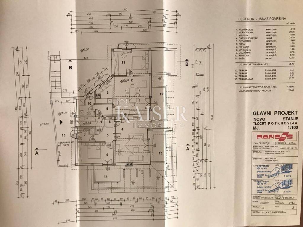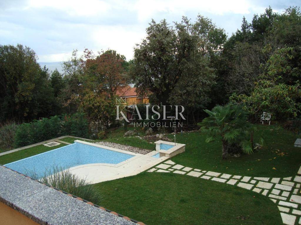 Kaiser Immobilien presents a quality built villa in a very attractive location in Lovran, 250 meters from the beach and 350 meters from the old town. The villa consists of a basement (87 m2) with a garage for 2 cars, a toilet, a bathroom and space for a wine cellar, a tavern with a fireplace and a sauna. An internal or external staircase leads us to the ground floor, where there is a large apartment of 145 m2 with a huge living room, kitchen, dining room, 3 bedrooms, 2 bathrooms. There is also a laundry room, a boiler room and an exit to a large terrace and a spacious garden. In the attic, which is accessible via an external staircase, there are 2 separate apartments with kitchen, dining room, living room, bedroom, bathroom and balcony (each of 50 m2). The owners of the villa rent these two apartments in the summer. The villa has a large garden of 1371 m2 with an infinity pool, barbecue, large oak trees and other Mediterranean plants. Several (10+) parking spaces are available around the house.