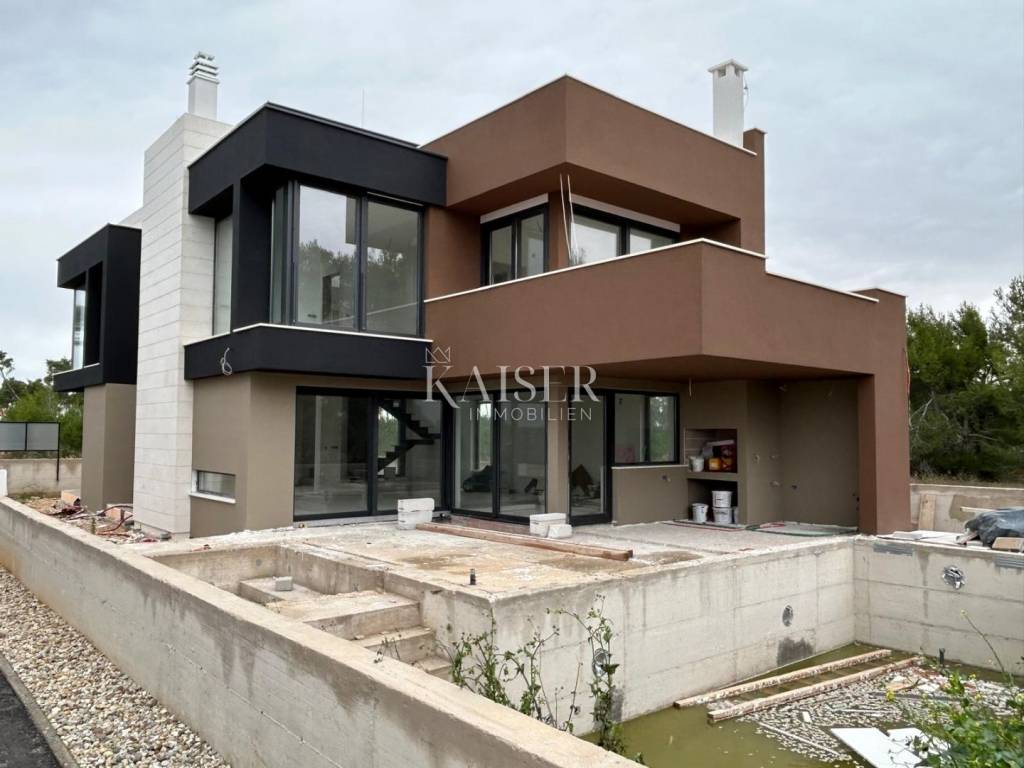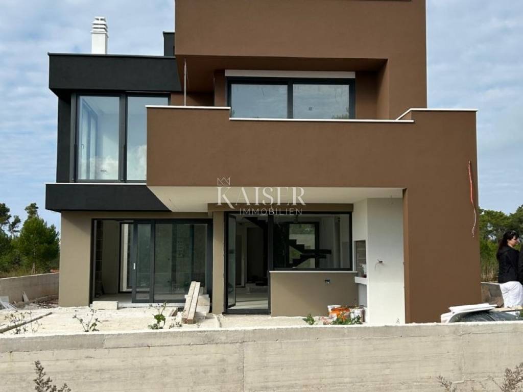 Kaiser Immobilien proudly presents this new building, a villa in the magical Privlaka, located in a quiet and sunny pine forest, in the immediate vicinity of the sea and the most beautiful sandy beaches of central Dalmatia. This property with a total living area of 317.68 m2, under construction with a planned completion in December 2025 on a plot of 455 m2, exudes sophisticated architecture, contemporary lines and a perfect blend of luxury, functionality and a sense of natural surroundings. The house extends over three floors - ground floor, first floor and roof terrace. It offers an ideal organization of space for family life, summer vacation or tourist investment. The ground floor consists of an entrance area with an imposing double staircase connecting all floors, a hallway with a wardrobe, a toilet, and a spacious living area that combines a kitchen, dining room and living room of 51.22 m2. The living room opens onto a sundeck and pool, while the kitchen leads to a covered terrace with an outdoor kitchen and barbecue - the perfect place for summer gatherings in the shade of pine trees. The ground floor also has one bedroom with its own bathroom and direct access to the garden. Upstairs there are three bedrooms, each with its own bathroom and dressing room, ensuring complete privacy and comfort. In addition, the floor includes a utility room (laundry and ironing room) and a technical room for housing the heating and cooling system equipment. The master bedroom on the southeast has access to a private terrace surrounded by planters that further enhance the impression of Mediterranean peace and intimacy and create green oases at every step of the villa. The roof terrace is divided into a walk-through part oriented southeast, which offers the possibility of installing a jacuzzi (installations are prepared), and an impassable part oriented northwest, intended for external units of the heating/cooling system. The total area of the terrace is 38.44 m2, and the 9 m2 atrium provides an additional impression of elegance and airiness. The 18.28 m2 basement houses the pool equipment, and access is possible via an external staircase from the terrace. The yard offers enough space for additional horticultural landscaping, recreation or creating a private Mediterranean garden, while two parking spaces and an asphalted access road are provided. The villa is equipped with modern systems: electric heating, heat pump, underfloor heating and an air conditioning system for a comfortable temperature throughout the year. High-quality aluminum joinery ensures the longevity and aesthetic value of the building. Its microlocation is what makes this property special - it is located in the immediate vicinity of the most famous sandy beaches of Privlaka such as Mostina, Škrapavac, Pliša, Sela, Sabunike and Vrila. Mostina is known for its healing black mud and shallow sea ideal for children, Škrapavac offers entertainment and an aqua park, Sabunike is a paradise for surfers, while Pliša and Selo are perfect for families and relaxation. Privlaka, a former fishing village between Nin and the island of Vir, is today one of the most desirable coastal towns on the Zadar Riviera. Rich in history, legends and authentic Dalmatian spirit, it offers the ideal balance between peaceful surroundings and proximity to urban infrastructure. It is only 18 km from Zadar and 5.5 km from historic Nin, and excellent transport connections and proximity to all important amenities further increase the value of this location. This villa represents an exceptional opportunity for those looking for the perfect combination of a Mediterranean lifestyle, modern construction, privacy and prestige. Whether you are looking for a family home, a luxurious holiday home or a smart investment with long-term potential - this property has everything you have been looking for. Construction began in the fall of 2024, and completion is scheduled for December 2025. The documentation is in order, and floor plans are available upon request. The agency's commission for the buyer is 3% + VAT. The commission covers all services related to the purchase and is paid only in the case of purchasing a property, upon conclusion of the first legal act. For more detailed information, please contact: Ivana Skoblar Tel: +385 98 973 11 54 E-mail: ivana.skoblar@kaiser-immobilien.hr Property code: 136-18