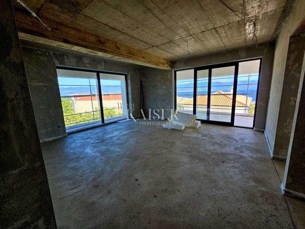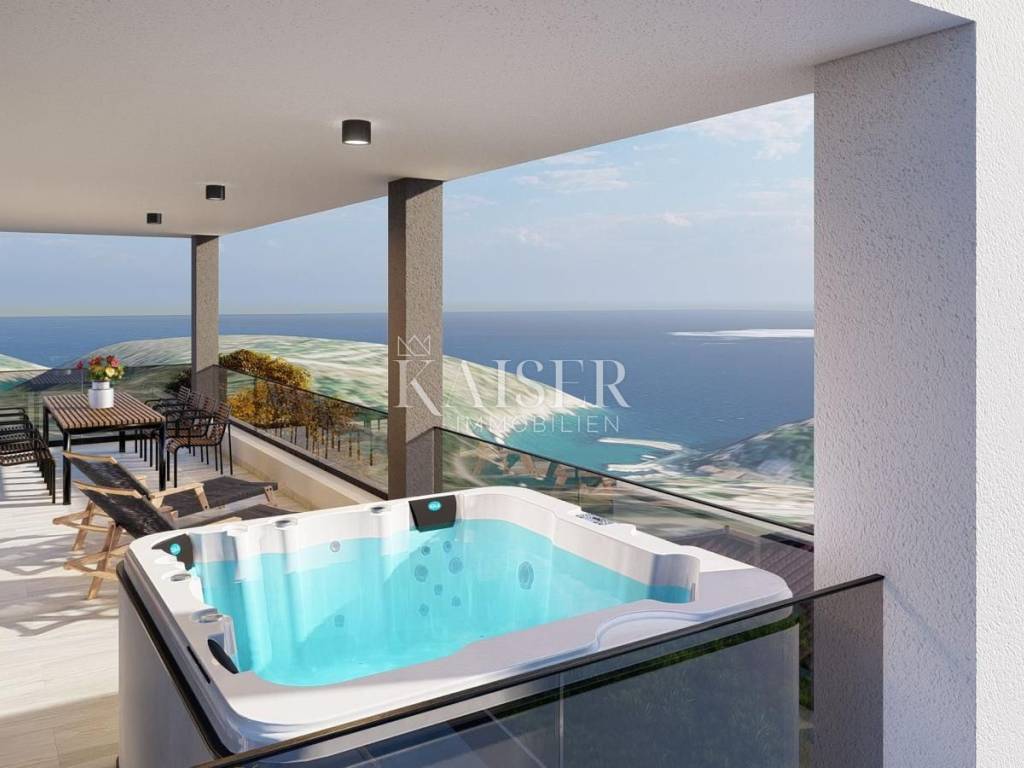 Kaiser immobilien is mediating the sale of a luxurious two-bedroom apartment with a sea view, on the 1st floor of a two-story building in a new building, in the town of Vrbnik on the island of Krk. The apartment, with a total area of 106m2, consists of an entrance hall, an open-concept living area of 27m2, which includes a living room, kitchen and dining room, bedrooms, bathrooms, and a master bedroom with an en suite bathroom. The living room, as well as both bedrooms, leads to a spacious covered terrace of 39m2, an ideal place to enjoy summer evenings and a panoramic view of the sea. The apartment also includes a storage room in the basement of the building, and two parking spaces. The property is being built and equipped with top-quality materials, so the apartment will have underfloor heating and air conditioning in all rooms, a heat pump, aluminum joinery, floor coverings and sanitary ware made of top-quality ceramics. The expected completion of construction and the deadline for moving in is the end of 2025. The agency's commission for the buyer is 3% + VAT and is paid in the case of purchasing a property, upon conclusion of the first legal act. ID CODE 105-276