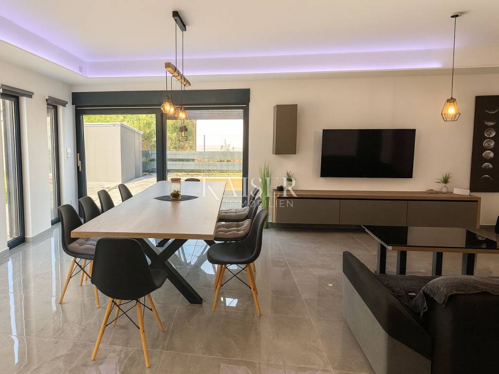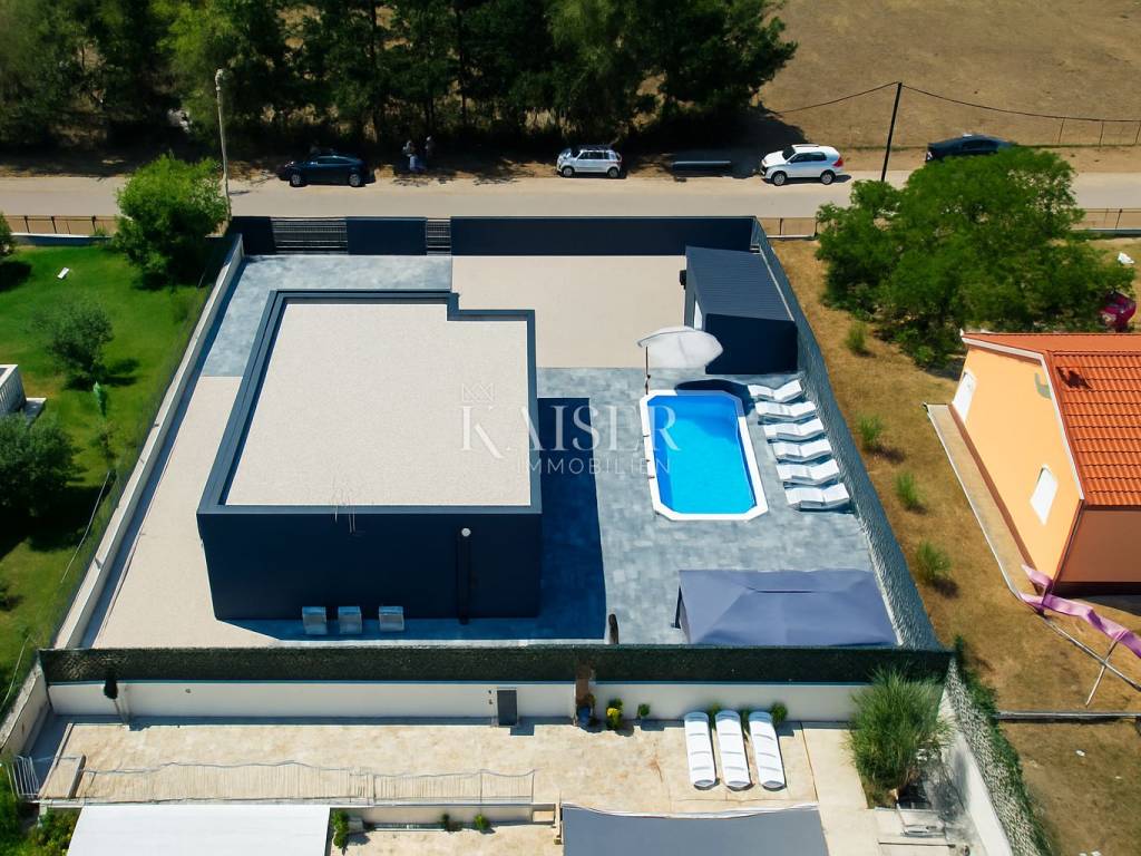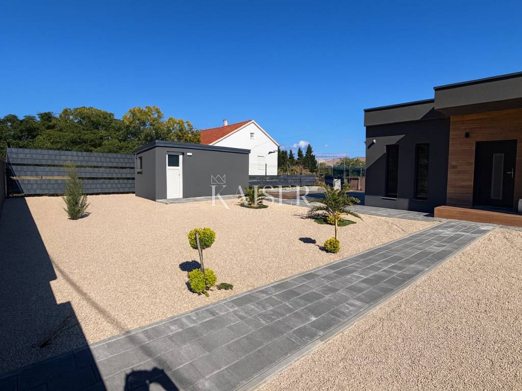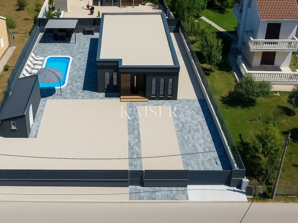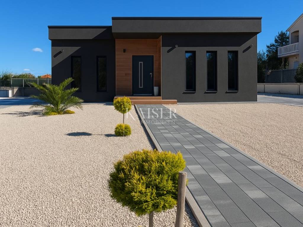 Kaiser Immobilien presents a modern single-storey house with simple lines and contemporary design, located in a quiet part of Ninski Stanovi - just a few minutes' drive from royal Nin and ten kilometers from Zadar.