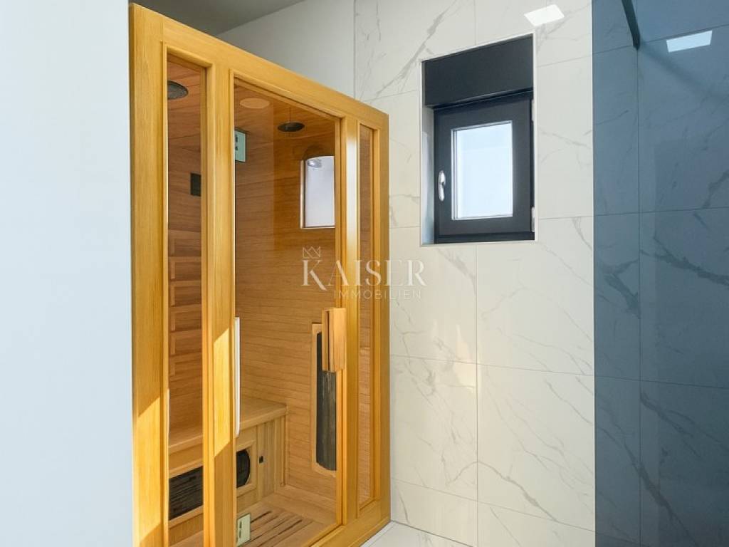 The bathroom is elegantly designed, with a washing machine and dryer and an integrated sauna that brings a touch of luxury and wellness atmosphere to everyday life.