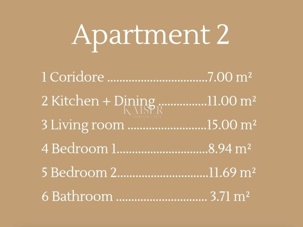 Apartment D8 app2 Kaiser Immobilien offers for sale a beautiful resort that is only in the construction phase, and already entices with its location, i.e. the combination of proximity to large cities and the beautiful Istrian coast. This wonderful place is located in an attractive location between Novigrad and Umag, which are only 10 minutes away by car. It is only 100 m from the sea and well-kept beaches. In the immediate vicinity there are restaurants, cafes, promenades, bicycle paths and various other facilities. This resort is designed and engineered to make your life luxurious, comfortable and convenient. The special feature of this resort is not only the exceptional location, but also the closed resort itself, which offers, in addition to excellent facilities, such as a reception, restaurant, wine bar, shared pool, spa and relaxation zone, gym, and there is also a charging station for your electric pets. There will also be environmental maintenance and other services. You can be safe inside the resort because the resort will be under video surveillance 24/7. This luxury apartment is located on the ground floor of a building with a total of 4 apartments. It covers a gross area of ​​65 m2, of which the net usable area is 57 m2, while the total size of the terrace is 8 m2. It consists of two bedrooms, a bathroom and a living room with a kitchen and dining room and an exit to the terrace, which you can enjoy all year round. The resort consists of 21 villas and 16 apartments, offering three different types of villas and four different types of apartments. Villas range from 202m2 to 274m2, with prices from €800,000 to €1,320,000, while apartments offer a compact luxury option with areas from 53m2 to 128m2 and prices from €280,000 to €630,000. All prices are without VAT. The works have already started in September 2023, and the resort is expected to be ready for you during the summer of 2025. Don't miss your chance to be a part of this enchanting seaside paradise in the making. The commission of the agency for the buyer is 3% + VAT and is paid in the case of real estate purchase, at the conclusion of the first legal deed. Distance: Pula Airport - 80 km Ljubljana - 136 km Munich - 537 km Vienna/Vienna - 518 km Prague - 844 km For additional information and viewing, contact your agent by email: dean.cvitko@kaiser-immobilien.hr or phone number: 00385 91 5284449