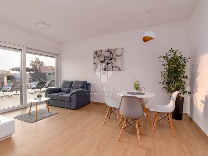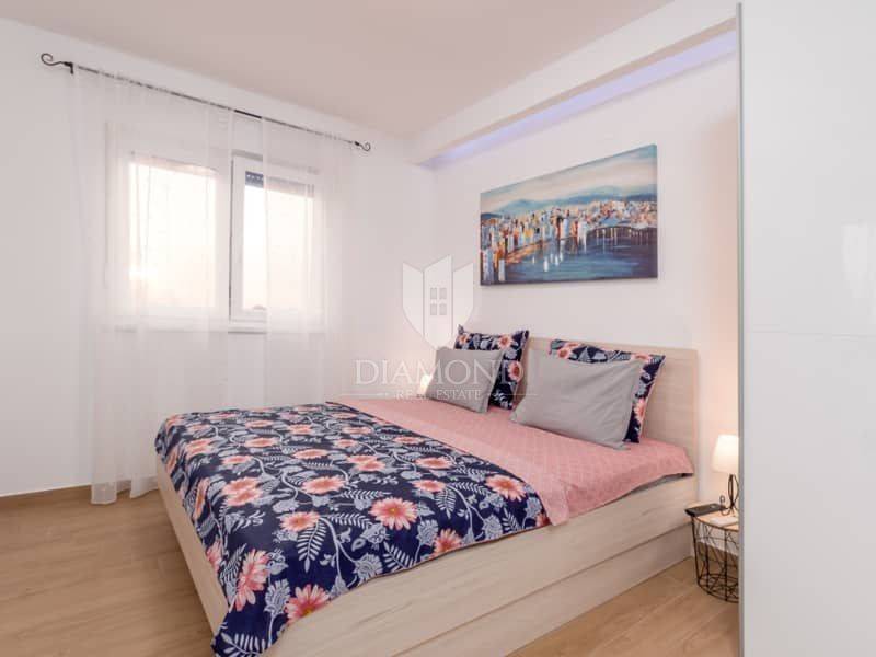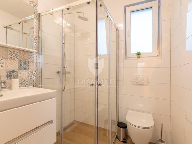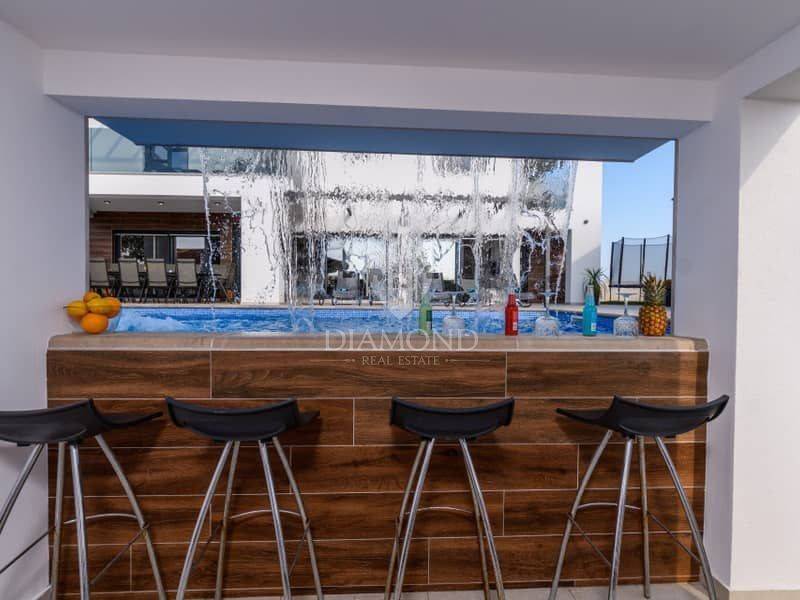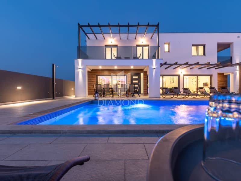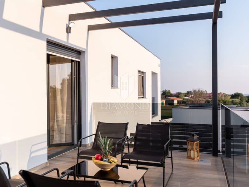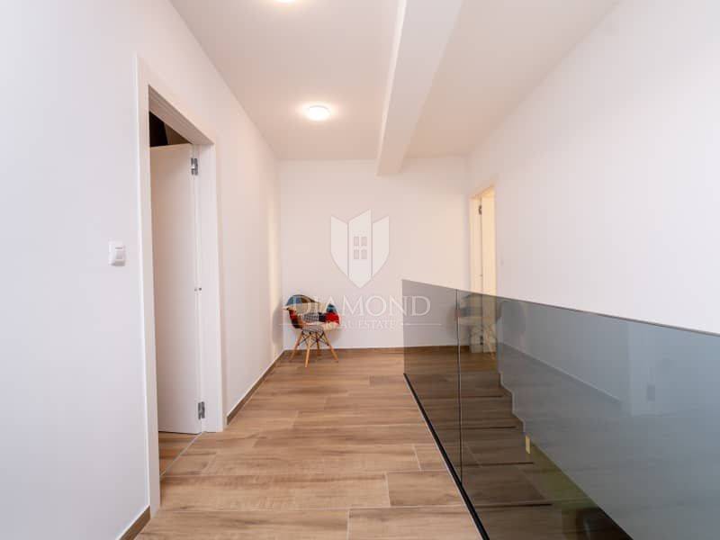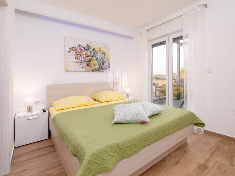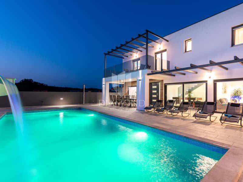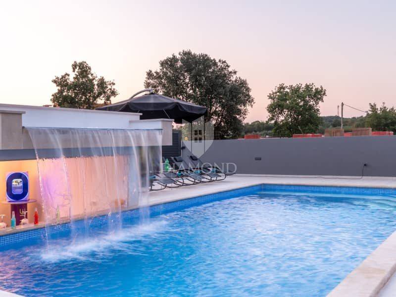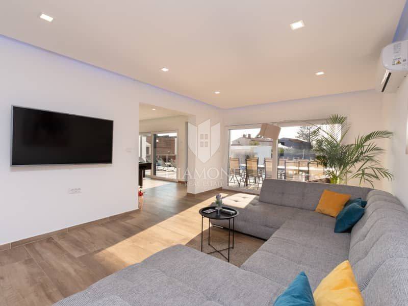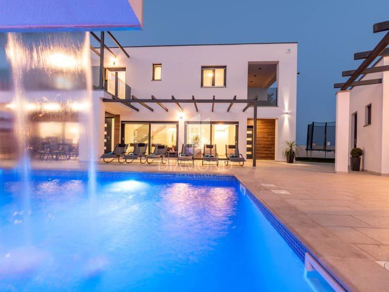 Istria, surroundings of Pula We present to you this modern spacious house in the surroundings of Pula. The house consists of two parts. The first larger part of the house has a living room, a guest toilet and one bedroom with a bathroom on the ground floor and, of course, access to the pool. on the first floor there are 4 more bedrooms, each with its own bathroom. Next to this part of the house is a smaller apartment with a living room, kitchen and bathroom on the ground floor and a bedroom with its own bathroom on the first floor. The whole house is of course air-conditioned and the pool is heated. The pool is also equipped with hydromassage functions. There is another guest toilet next to the pool, so you don't have to go into the house when using the pool. The entire garden has irrigation. The house is superbly made and superbly filled for tourist purposes. And the location is only 10 minutes from Pula.