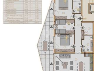 The apartment consists of a spacious hallway with a wardrobe that leads you to three comfortable bedrooms, two of which have access to a common terrace of 35 m2 with a wonderful view of the sea. Two modern bathrooms provide additional comfort and privacy. The spacious living room, together with the kitchen and dining room, also has access to a beautiful terrace, perfect for relaxing and enjoying the outdoors. The total area of the apartment is 106 m2. The apartment also comes with two parking spaces, which can be chosen between garage or outdoor and are additionally charged.