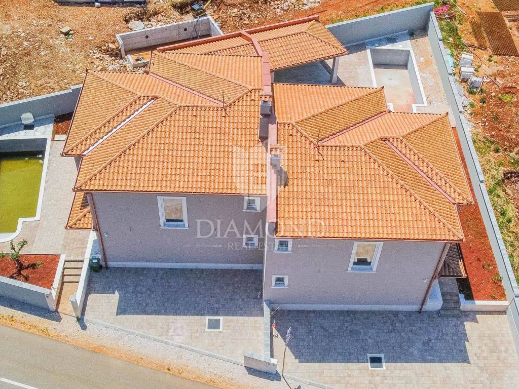 The house has a total area of 173 m2 and extends over two floors. On the ground floor there is a living room with a kitchen and a dining room, a bathroom, a storage room and a covered terrace. The first floor is accessed by internal stairs, where there is a technical room, two bathrooms, 3 bedrooms and a terrace. There is a beautiful swimming pool and sunbathing area in the landscaped garden, as well as another additional building that will serve as a summer kitchen. The heating is on the floor and the cooling is on air conditioners. If desired, there is also the possibility of installing a fireplace. The house has 3 parking spaces.