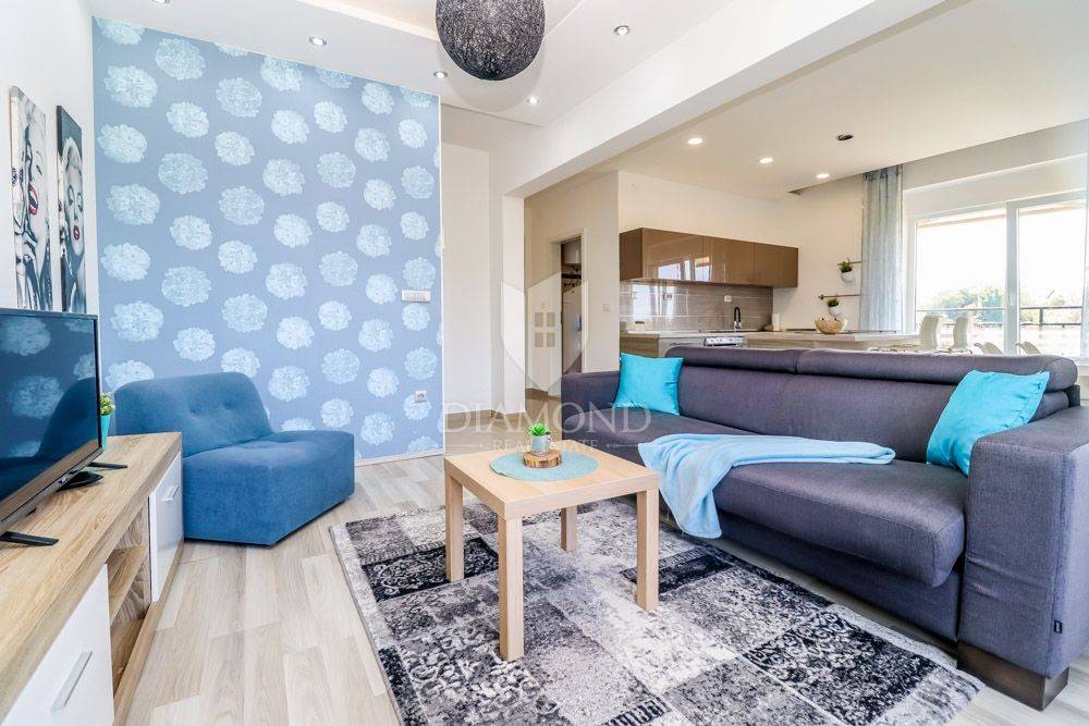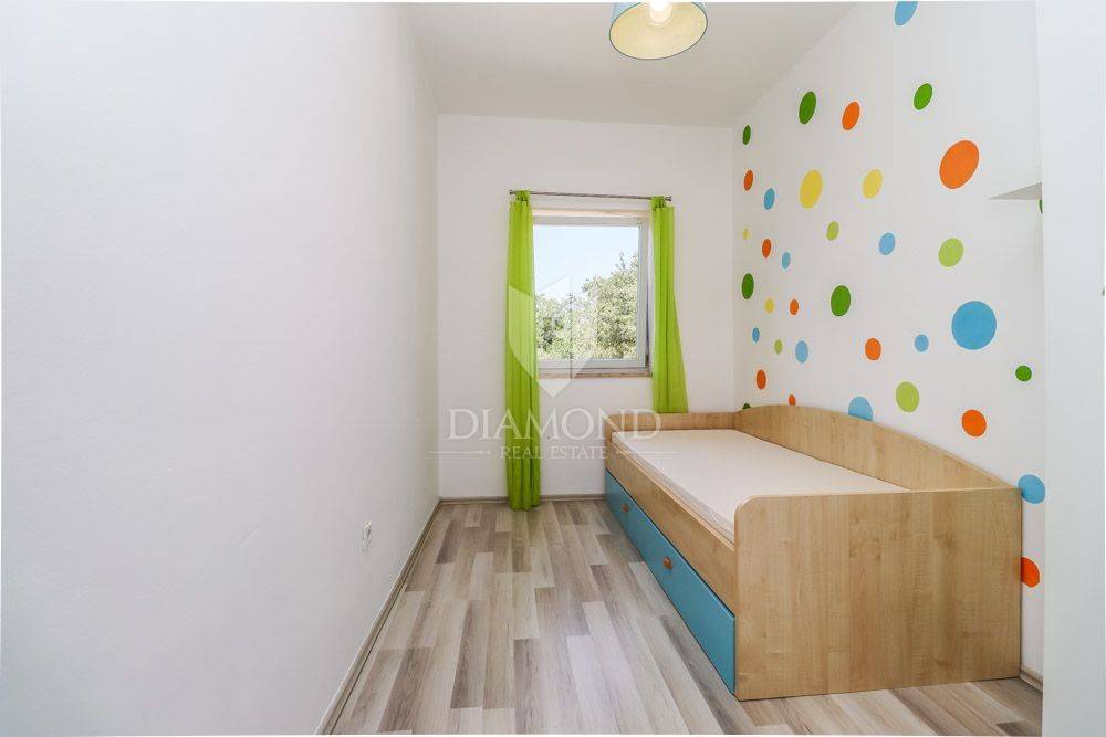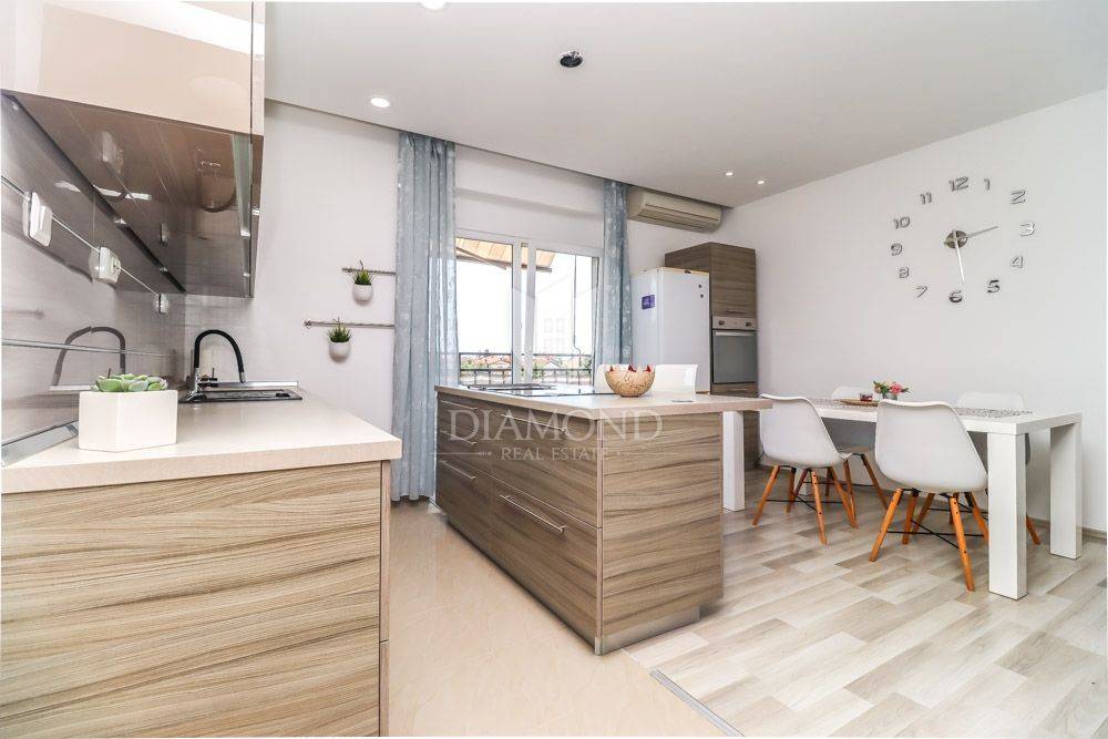 The apartment consists of two bedrooms, living room and kitchen with dining room. Two terraces, one large that runs the length of the side of the apartment and a smaller one on the side from the living room. The apartment is very bright. The kitchen is modernly equipped with all the necessary appliances, and it also has a kitchen island with a stove/plate, and a large work surface for preparing meals. The bedroom has a large bed and a wardrobe, while the children's room has a bed with a drawer and a smaller wardrobe. There is also a closet in the hallway for storing things.