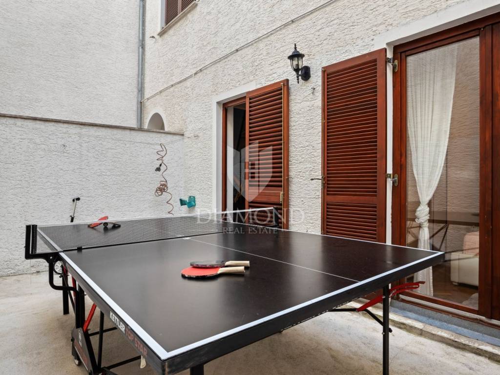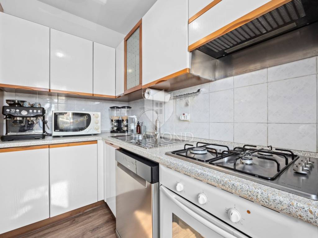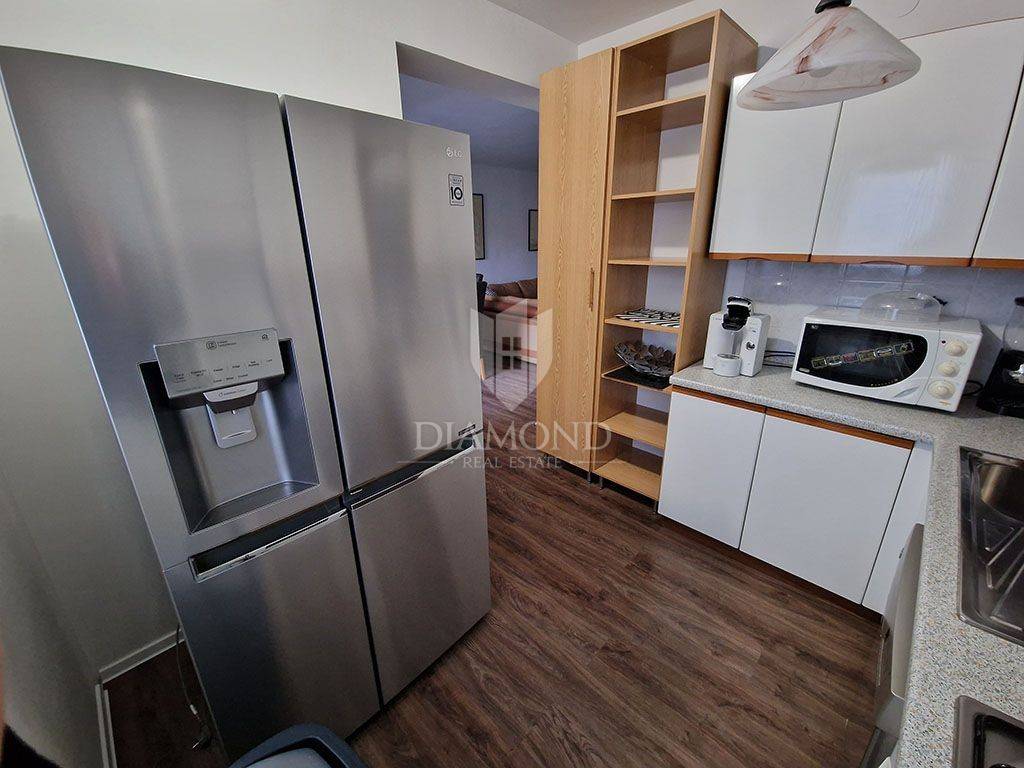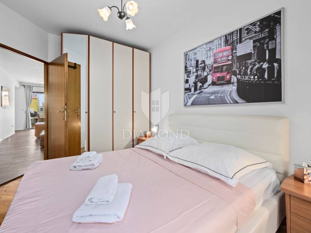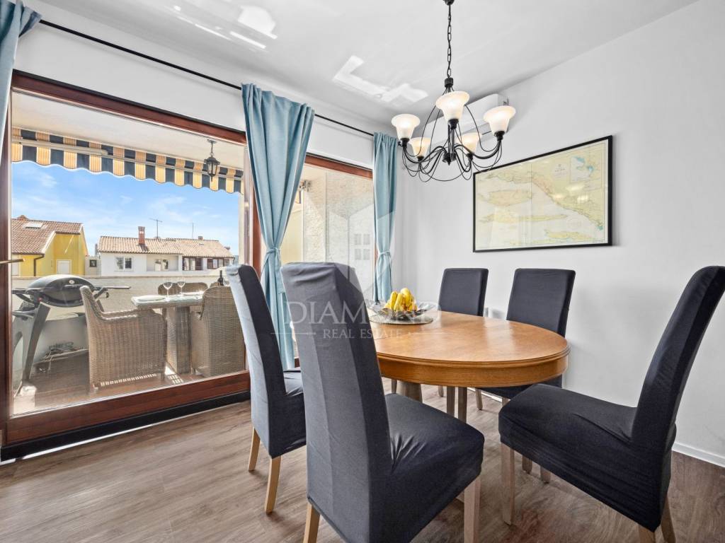 The apartment is located in a sought-after location full of tourist potential and already has an elaborate rental business during the season. This property has an area of 84m2 and consists of two bedrooms, a large living room with a kitchen equipped with custom-made elements. Each bedroom has spacious beds and access to the inner terrace, which has great potential and can be used for various purposes, such as a cinema or recreation area. The living room has access to the front terrace and a view of the marina. The terrace is about 15 m2 and can accommodate 6-8 people.