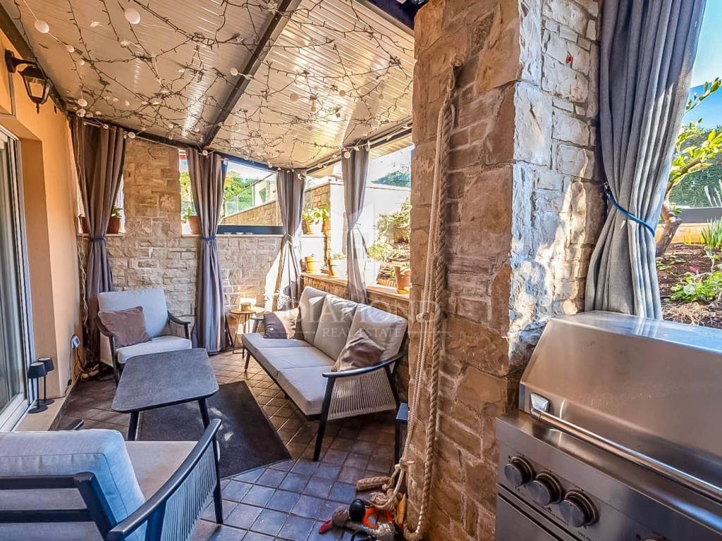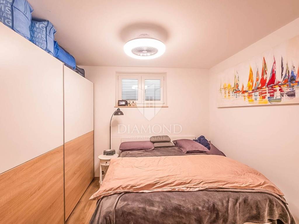 The apartment consists of two bedrooms, a kitchen, dining area and living room forming a pleasant and functional space for everyday life or holidays. The living room is warm and inviting, with plenty of natural light and access to a private covered terrace – the perfect spot for morning coffee, gatherings with family and friends or relaxed summer evenings. A special asset of this property is a small, carefully landscaped garden, ideal for growing herbs, flowers or creating your own green corner. The outdoor area is completed by a stylish lounge zone and a space prepared for a barbecue/outdoor kitchen, turning this apartment into a true small Mediterranean oasis. The building offers a shared swimming pool for all residents, which makes this property extremely attractive both for tourist rental and as a second home for holidays in Istria. Thanks to its layout, charming exterior and access to the pool, this apartment is an excellent choice as a family home or a holiday apartment in Medulin.