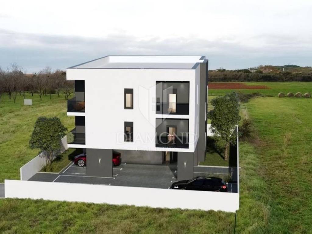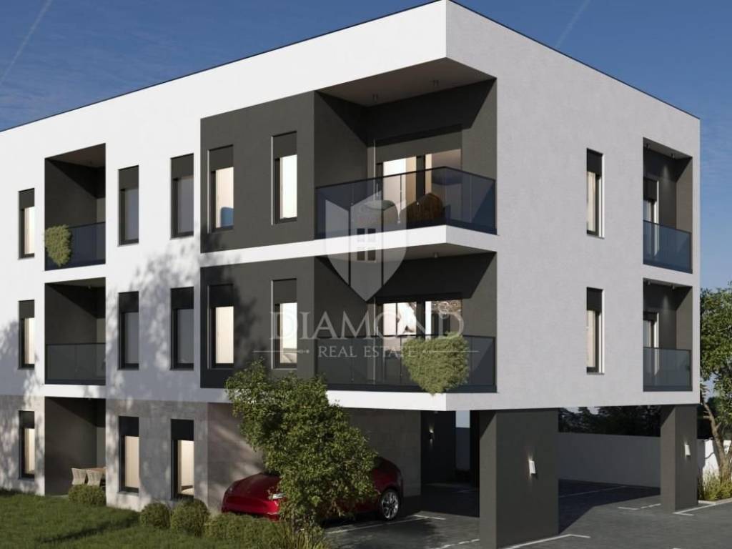 The apartment is located on the first floor of a smaller residential building. This excellent apartment with a total area of 99.10 m2 consists of an entrance with a wardrobe, a living room, a kitchen with a dining room, two bathrooms, three bedrooms, a terrace, a loggia, and two parking spaces.